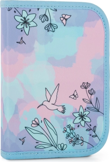 Součástí balení je jednopatrový penál s úchyty a síťovanou kapsou a lehký stahovací vak – vše v harmonickém pastelovém motivu s kolibříky.