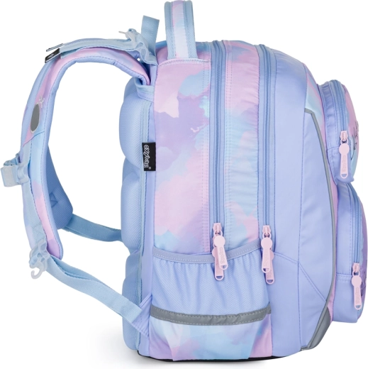 Design v pastelových tónech s motivem kolibříků a květin zaujme děti i rodiče. Odolné materiály, zesílené nepromokavé dno a množství reflexních prvků zajišťují dlouhou životnost a vyšší viditelnost. Součástí je jednopatrový penál s úchyty na psací potřeby a síťovanou kapsičkou a také praktický vak na přezůvky nebo sportovní vybavení ve stejném motivu.