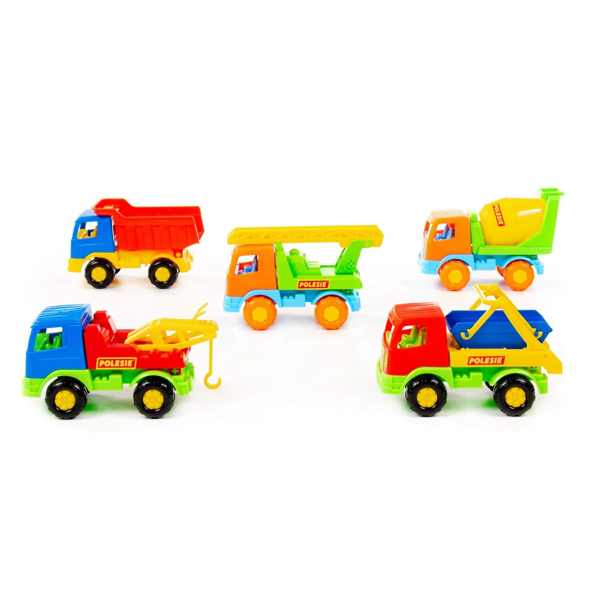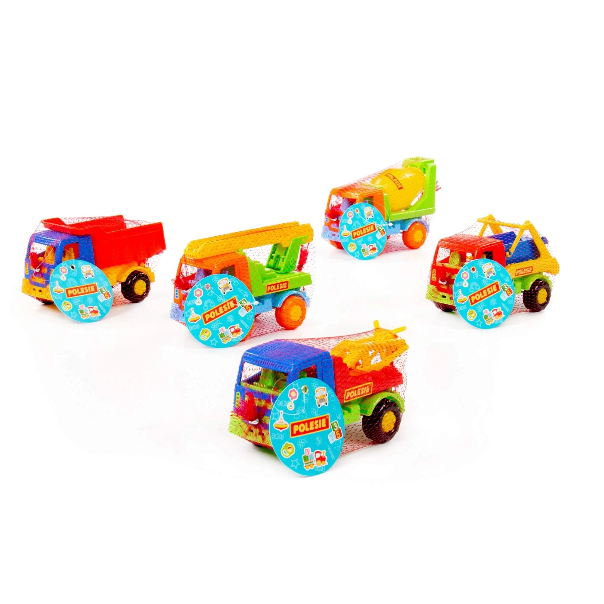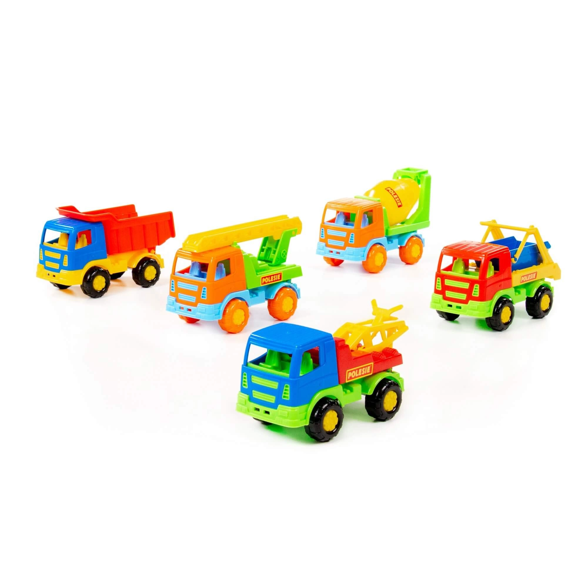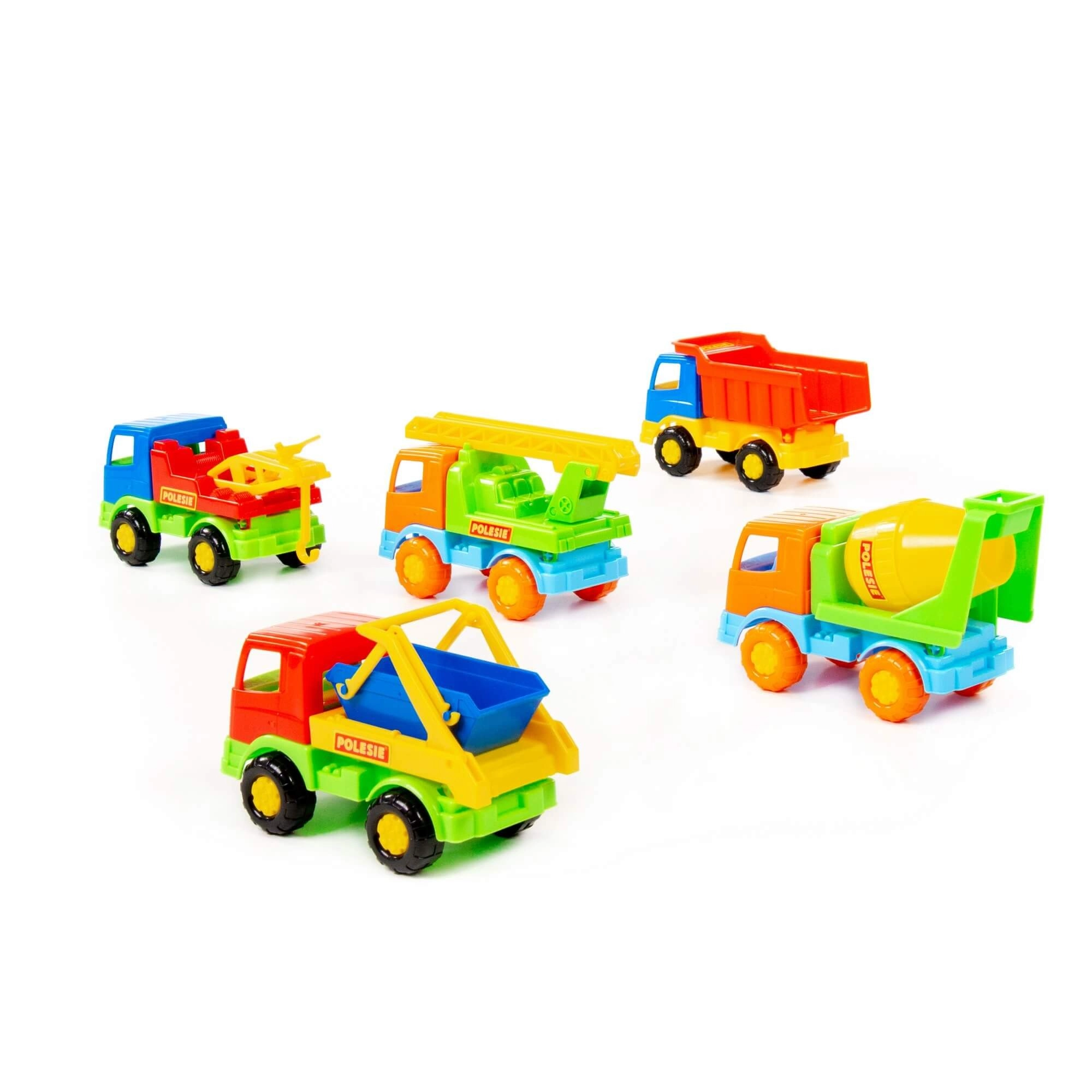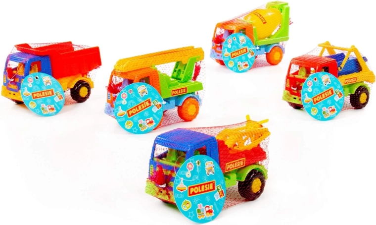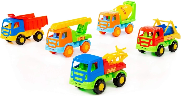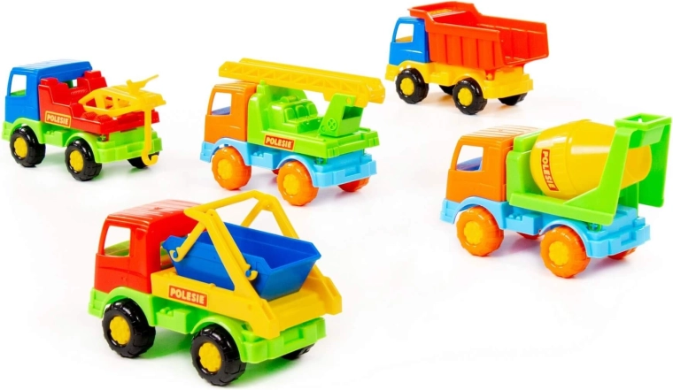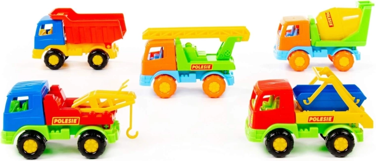 - Různé typy vozidel: sklápěč, míchačka, auto s žebříkem, vozidlo s hákem, stavební kontejner (dodáváno dle aktuálního mixu)
