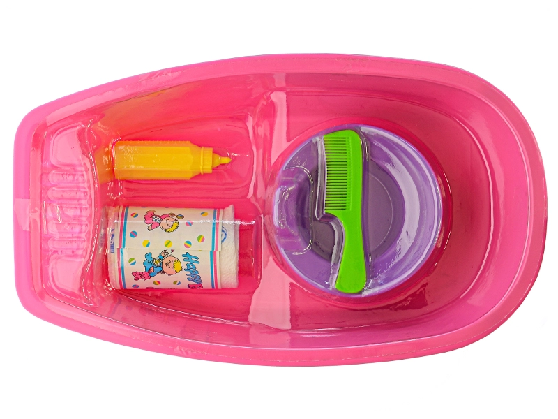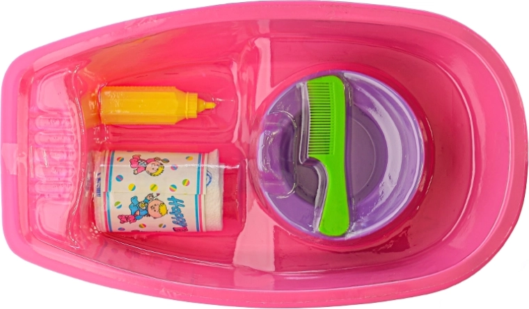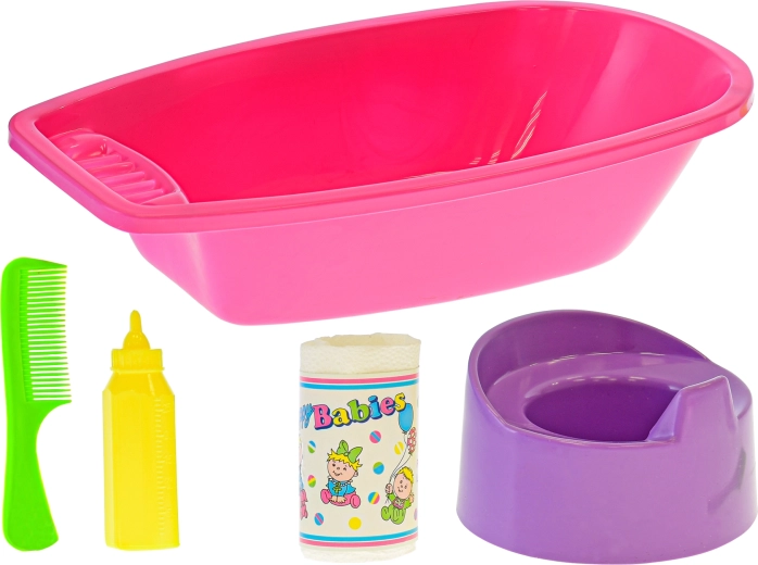 V sadě najdete vše potřebné: vaničku, nočník, hřebínek, lahvičku a drobné příslušenství. Děti mohou panenku vykoupat, učesat, nakrmit a posadit na nočník – to vše v jednom setu, který se snadno uklízí a je připravený na každodenní hraní.