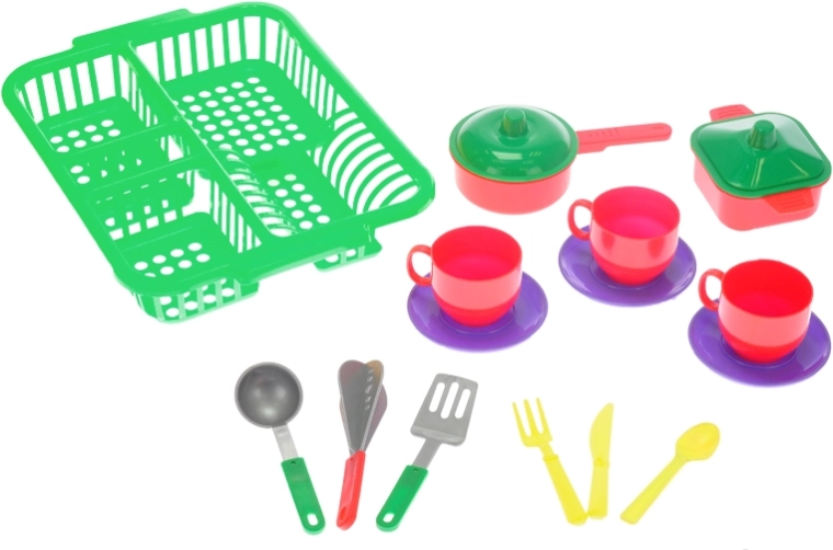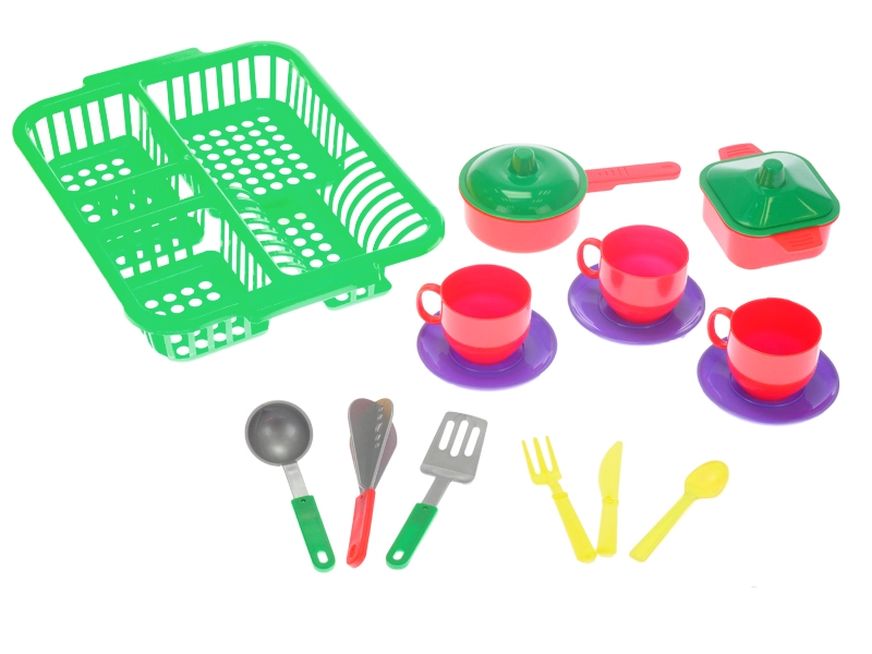 Tato dětská sada nádobí s praktickým odkapávačem nabízí vše, co je potřeba pro hru na vaření a uklízení v kuchyňce. Díky třem barevným variantám je hra ještě pestřejší a děti si snadno vytvoří vlastní kuchyňské rituály.