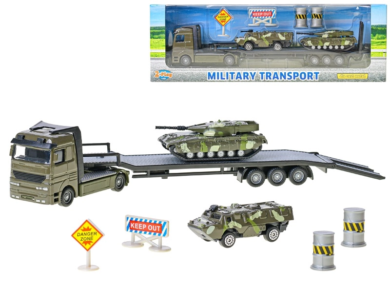 Objevte detailně zpracovaný set pro malé nadšence do techniky: vojenský transportér o délce 25 cm s volným chodem a dvěma obrněnými vozidly v měřítku 1:60. Odolná kombinace kovu a plastu, realistické detaily a bohaté doplňky (dopravní značky, zátarasy, barely) podněcují kreativitu, strategické myšlení a zábavnou hru dětí od 3 let.