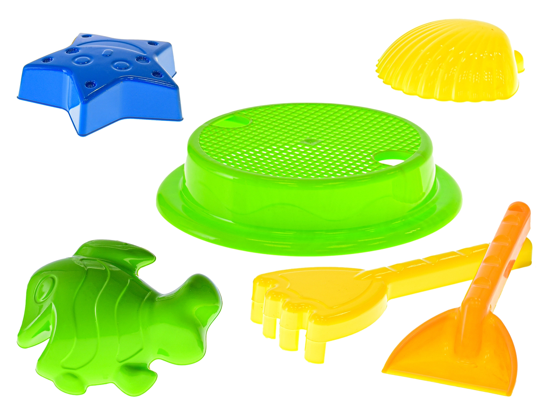 Sítko, lopatka, hrábě a 3 formičky v zářivých barvách motivují děti k objevování, stavění a tvarování písku.