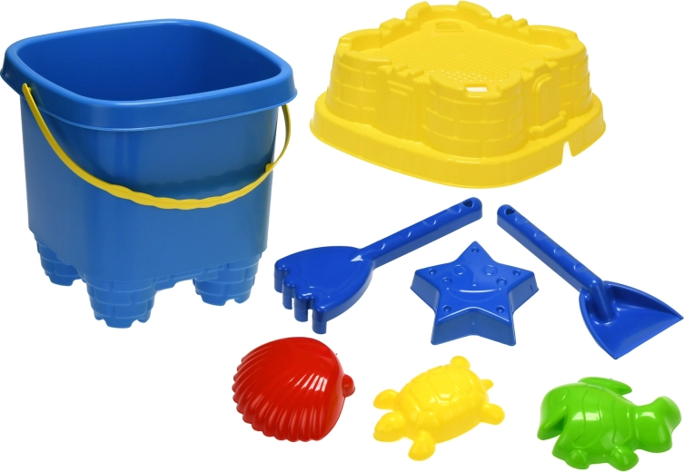 - Kompletní sada: kbelík s víčkem, lopatka, hrabičky a 4 formičky (10–11 cm)