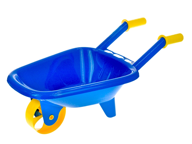 Přední kolo a zadní stojná noha drží kolečko v rovnováze při nakládání písku, hraček nebo zahradního materiálu.