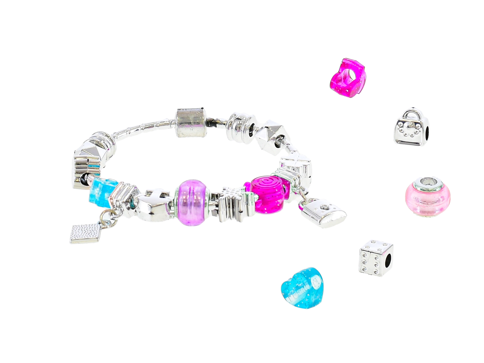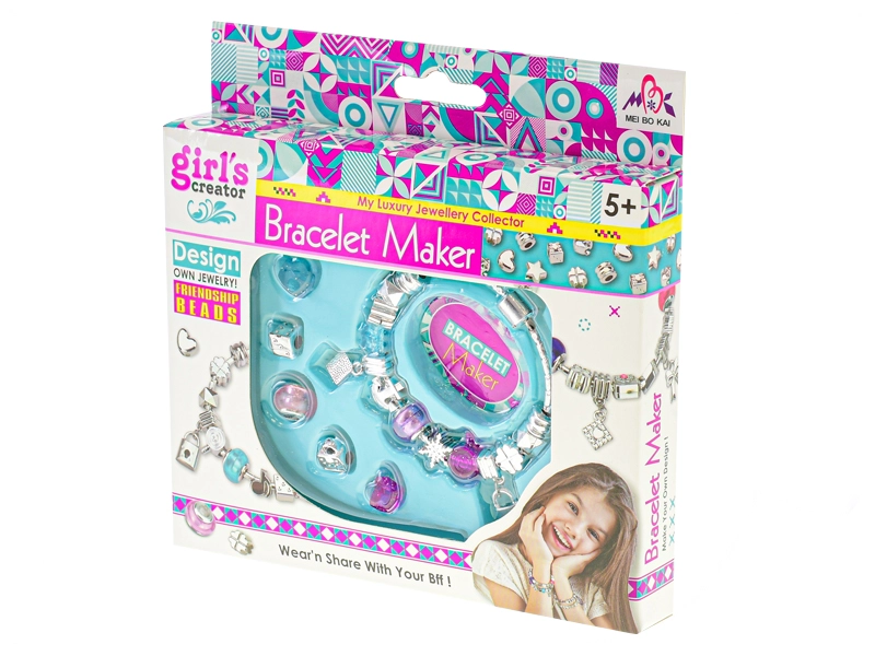 Kreativní set obsahuje odolný plastový náramek a různé přívěsky a korálky s velkým průvlekem pro pohodlné navlékání. Děti si mohou během chvilky poskládat vlastní barevnou kombinaci a měnit vzhled šperku podle oblečení či nálady.