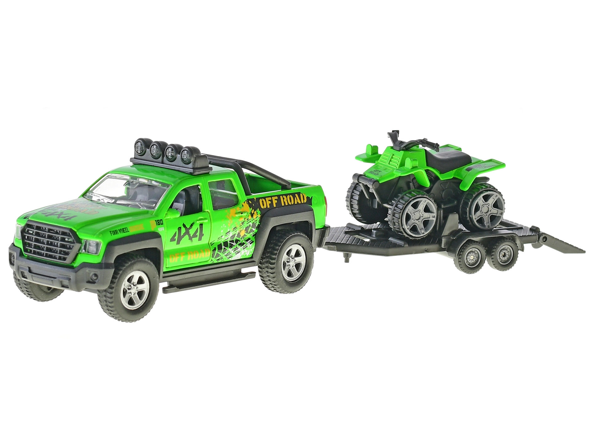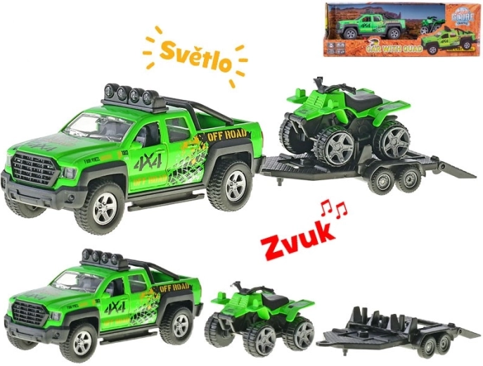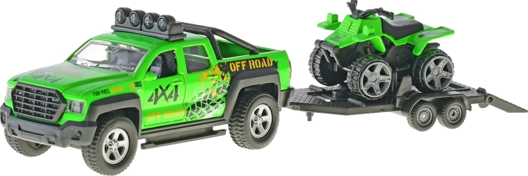 Detailní 4×4 pick-up s přívěsem a čtyřkolkou nabízí autentický herní zážitek – robustní kola, střešní světla a nájezdová rampa podporují kreativní scénáře.