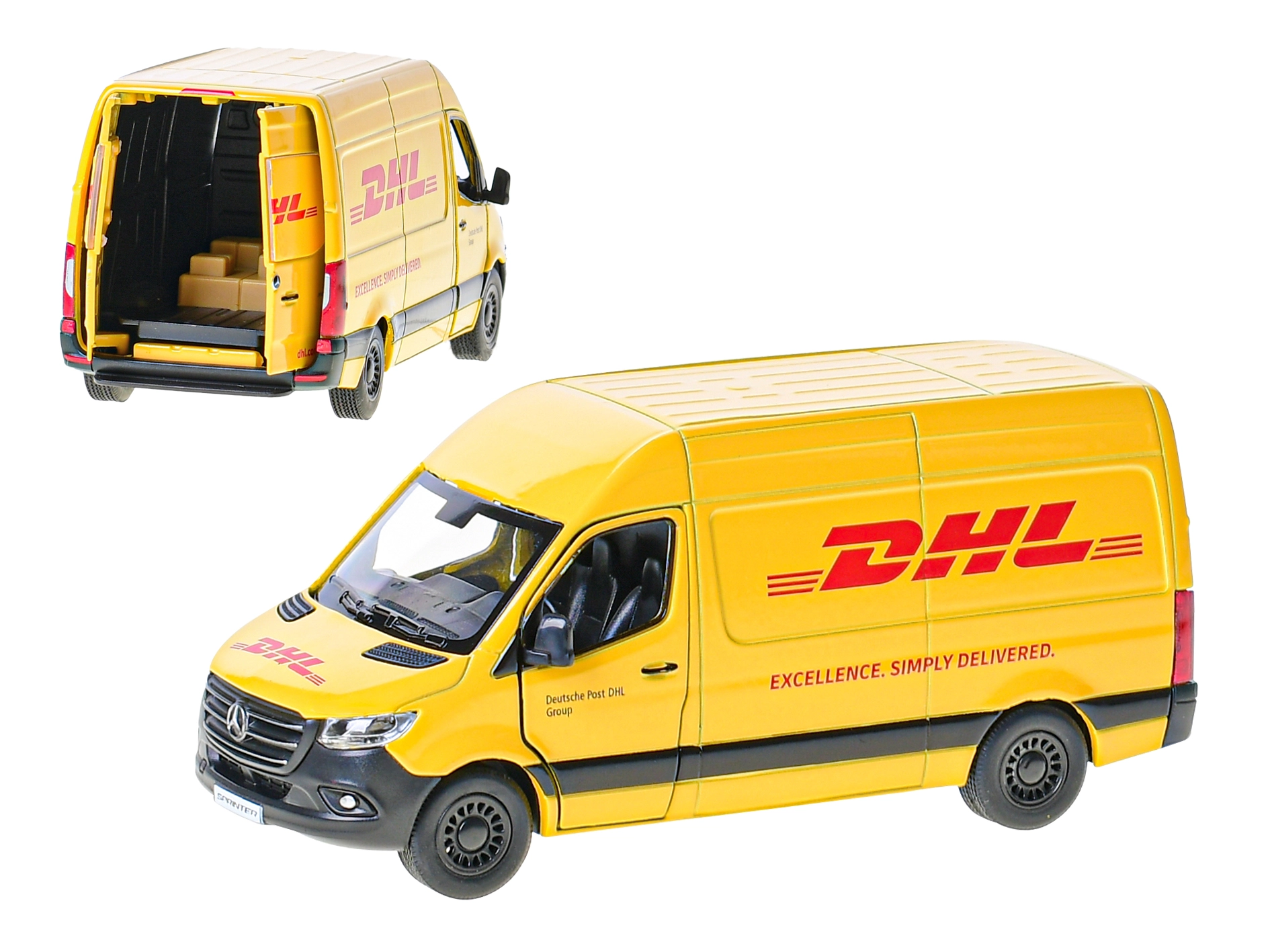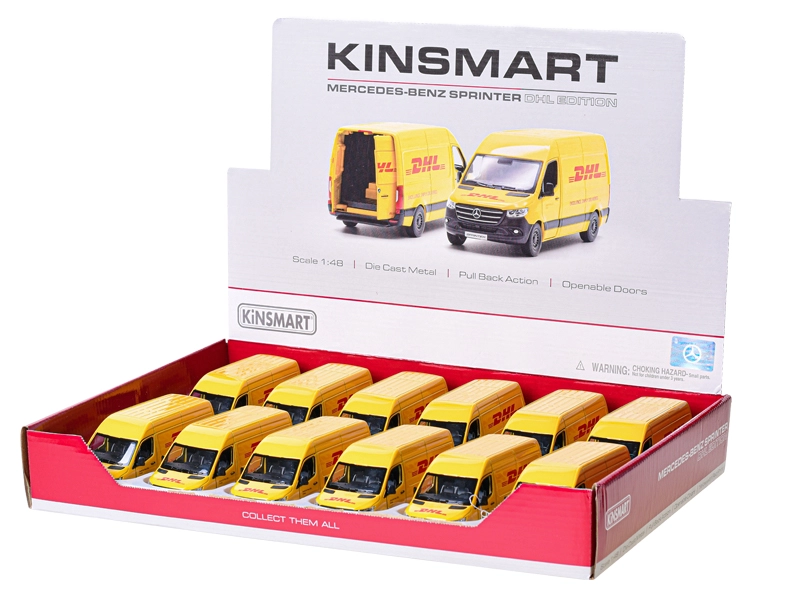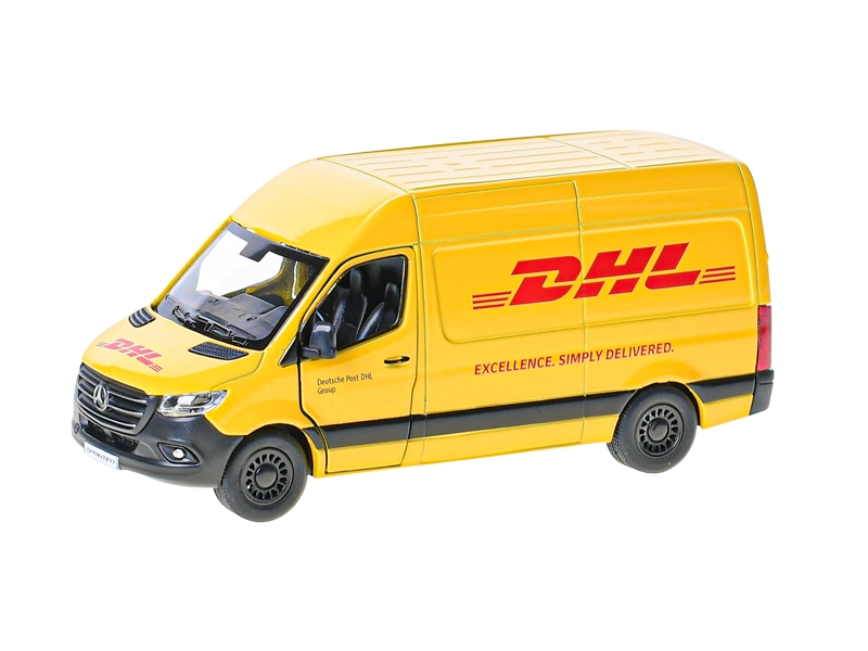Detailně zpracovaný kovový model dodávky Mercedes‑Benz Sprinter DHL v měřítku 1:48 potěší děti i sběratele. Nabízí otevírací boční a zadní dveře, funkci zpětného natahování pro jízdu vpřed a kvalitní provedení z kovu s plastovými doplňky. Autentický žlutý design s logem DHL z něj dělá atraktivní kousek do sbírky i na hraní.