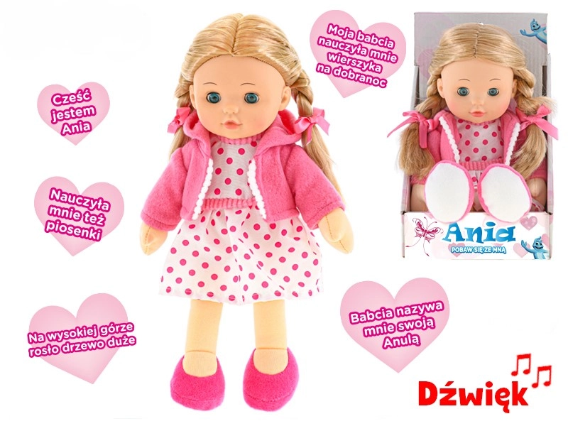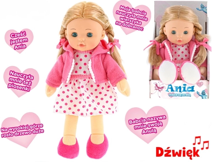 Panenka Ania je navržena pro nejmenší děti, které ocení její příjemně měkké tělíčko a realistické detaily. Díky polsky mluvícím frázím a zvukům podporuje hravou formou rozvoj jazykového vnímání a sociálních dovedností. Mrkající oči a stylové oblečení umocňují realistický zážitek ze hry.