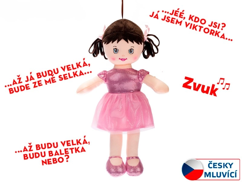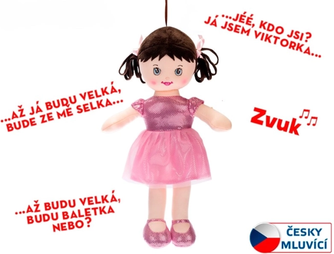 Panenka Viktorka je krásná hadrová kamarádka o velikosti 32 cm, která je jako stvořená pro každodenní hraní i usínání. Vypadá kouzelně ve světle růžových šatičkách a botičkách a díky mluvícím a zpívajícím funkcím přináší dětem ještě více radosti.
