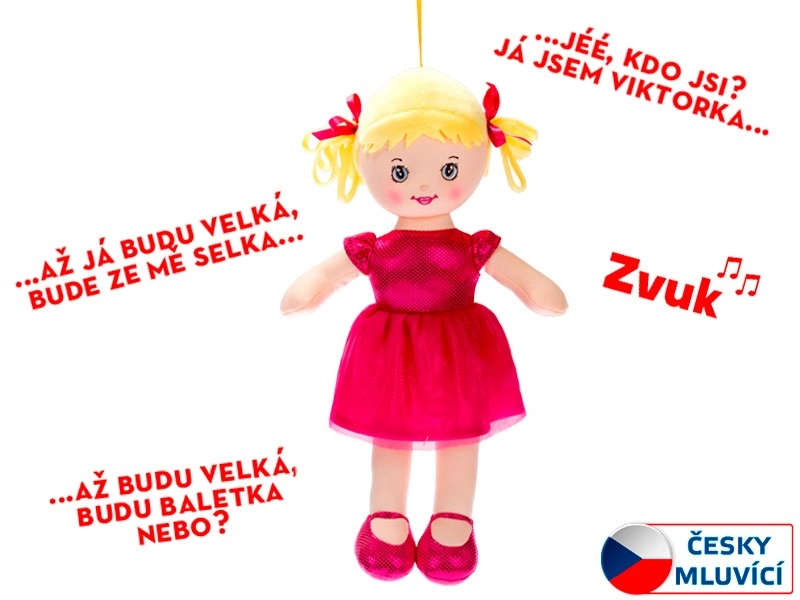 Panenka Viktorka je hebká látková kamarádka do postýlky i na cesty. V krásných šatičkách a botičkách láká k mazlení a hraní, zároveň rozvíjí sluchové vnímání a emocionální vazbu díky milému hlasu a písničce „Až já budu velká, bude ze mě selka…“.