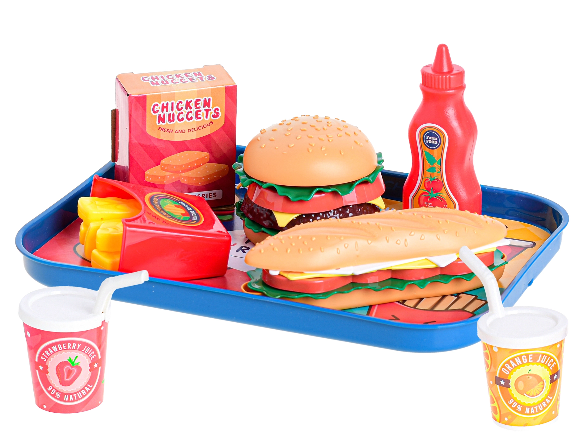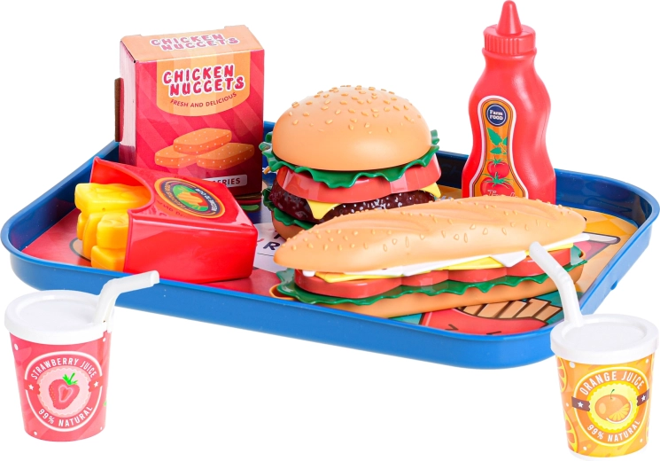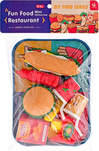 Pořiďte dětem zábavný fastfoodový set s podnosem, který obsahuje vše pro hraní na restauraci. Nechybí bageta, burger, limonády, nugetky a hranolky – celkem 26 dílů pro kreativní hru. Skvělé pro rozvoj fantazie, role-play a společnou zábavu s kamarády. Vhodné pro děti od 3 let.