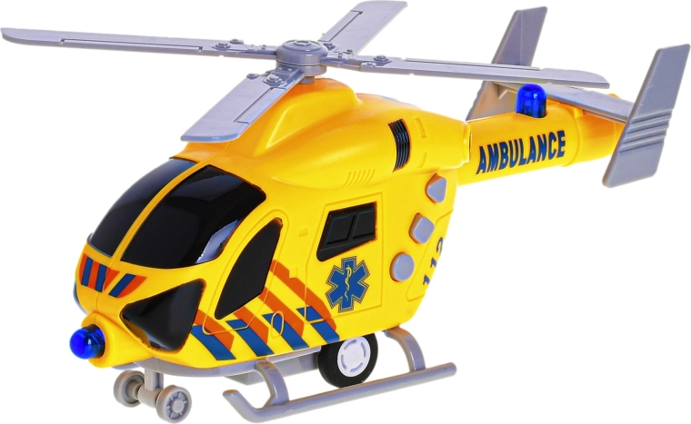Tato plastová záchranářská helikoptéra přináší dětem autentický zážitek ze záchranných misí. Díky setrvačníkovému pohonu se snadno rozjede jedním pohybem a realistické světelné a zvukové efekty umocní atmosféru hry. Žluté provedení s výrazným nápisem „ambulance“ zaujme na první pohled a podpoří dětskou představivost.