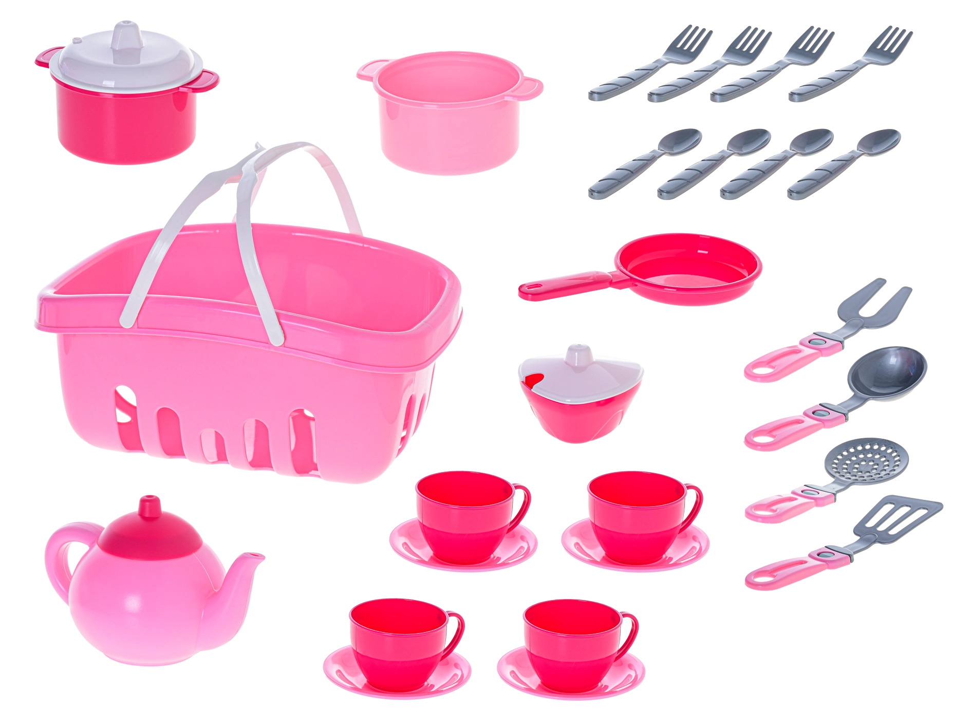 Tato kompletní dětská sada obsahuje čajovou konvici, hrnce s pokličkami, pánvičku, cukřenku, čtyři šálky s podšálky, příbory a kuchyňské náčiní – vše v praktickém košíku pro snadné skladování. Vhodné pro hraní na kuchaře, servírování a společenské hry, které podporují role-play, komunikaci a motoriku.