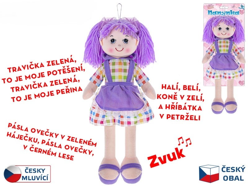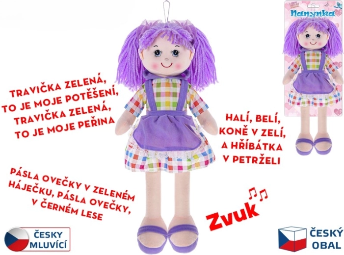 Roztomilá panenka Nanynka s měkkým tělíčkem potěší každou malou princeznu. Má výšku 50 cm, je oblečena do fialových šatiček a díky funkcím mluví a zpívá v češtině. Její měkké provedení zajišťuje bezpečné a pohodlné hraní už od narození. Součástí je napájení na 3× knoflíkovou baterii LR44.