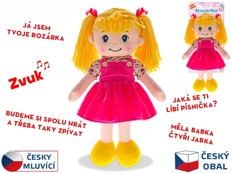 Seznamte se s panenkou Rozárkou – něžnou blondýnkou v krásných šatičkách a s vlásky spletenými do copánků. Díky měkkému tělíčku je příjemná na dotek a skvěle padne do dětské náruče. Mluví česky, takže děti přirozeně rozvíjejí slovní zásobu a komunikační dovednosti při každodenním hraní.