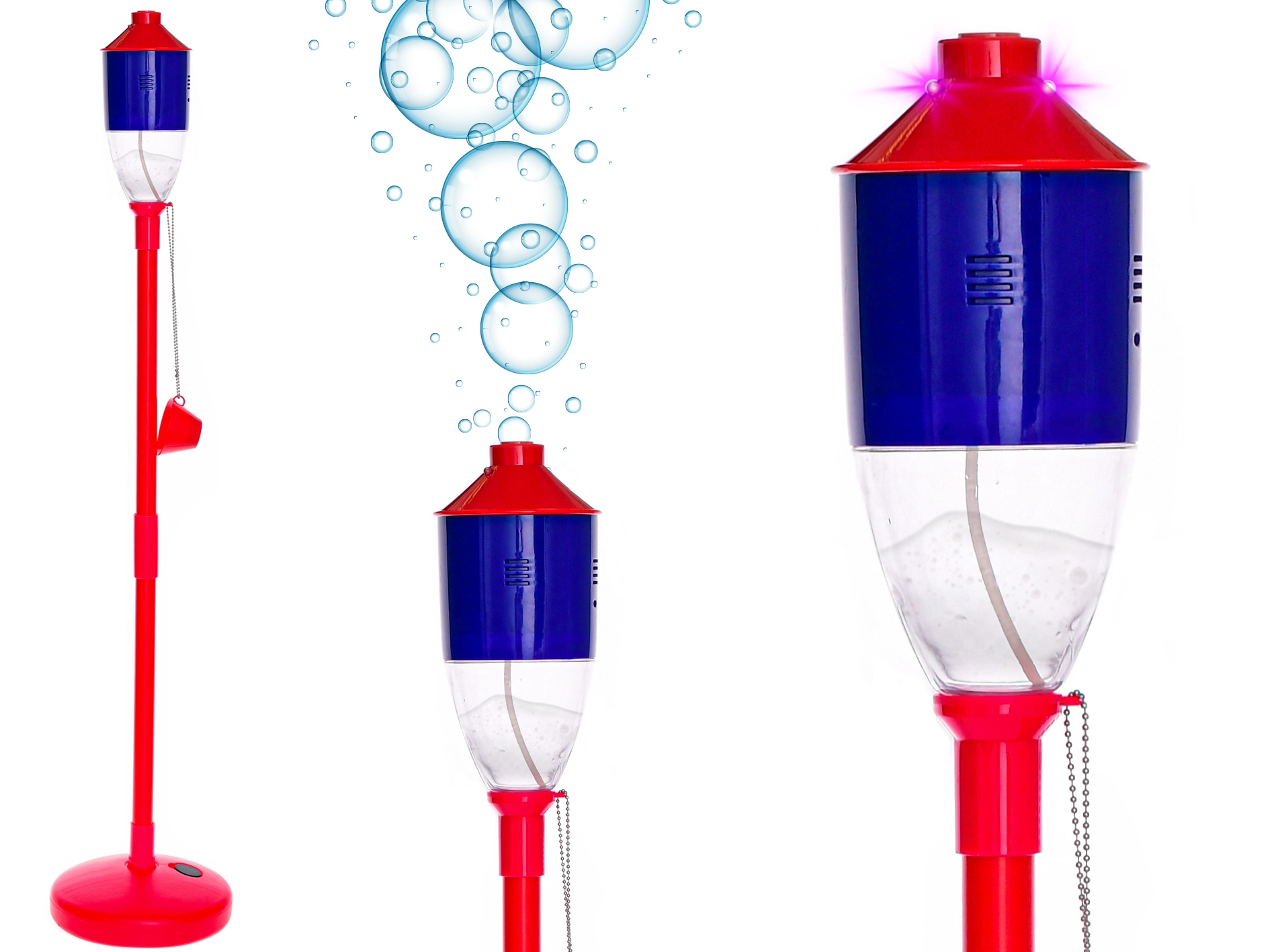 Oživte každou zahradní párty s tímto stojanovým bublifukem ve tvaru louče o výšce 132 cm. Po zapnutí automaticky vytváří bubliny a svítí, čímž vytváří kouzelnou atmosféru pro děti i dospělé. Jednoduché sestavení, stabilní základna s možností naplnění pískem nebo vodou a dvě barevné varianty – modrá a červená.