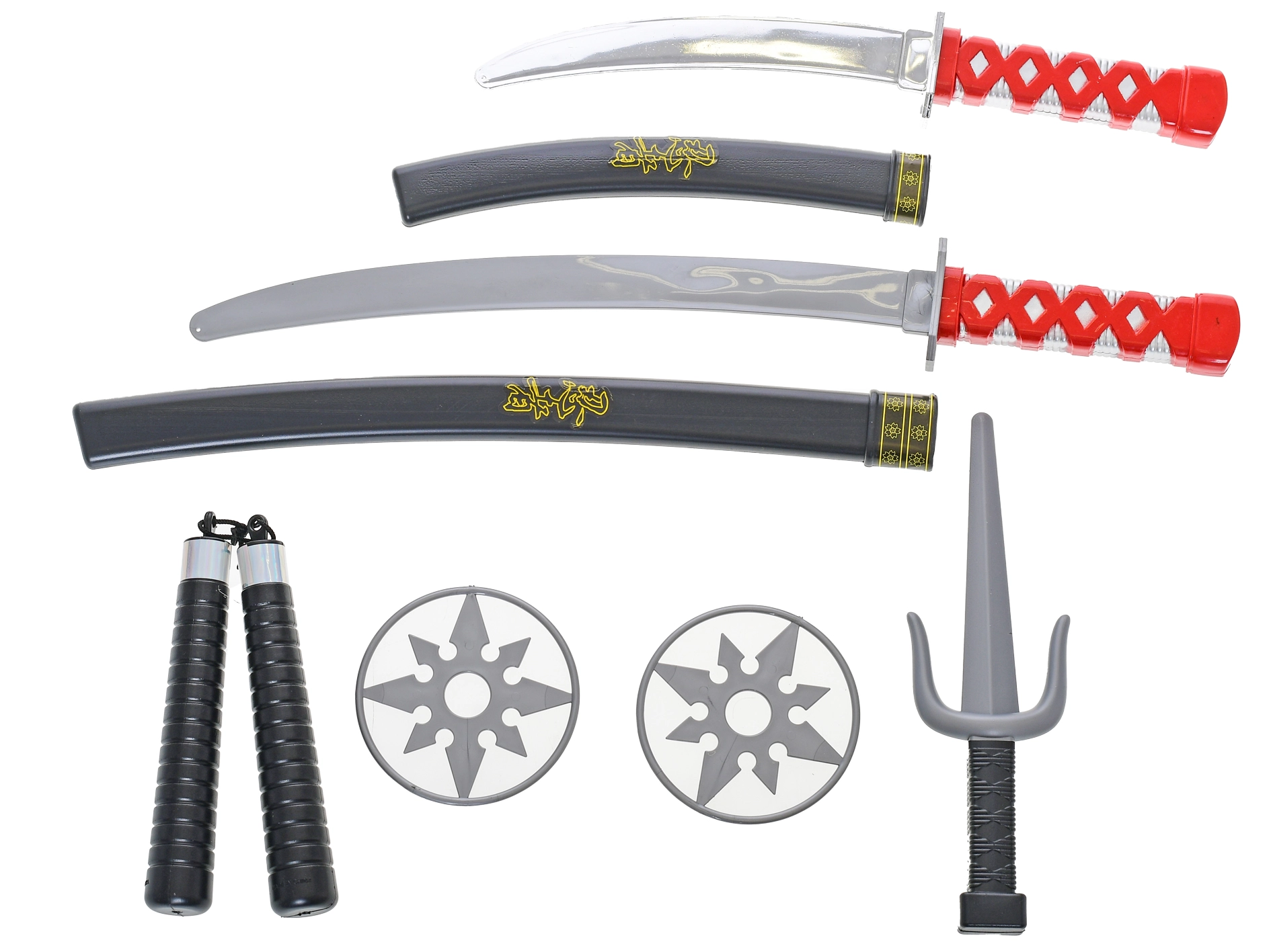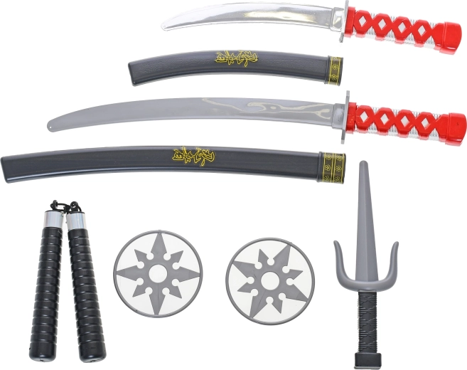 - 2× samurajský meč s pochvou, 1× dýka, 1× nunchaku, 2× vrhací hvězdice