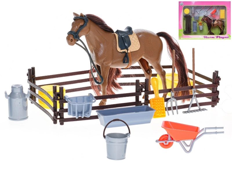 Realisticky zpracovaný set Kids Globe kůň 18 cm potěší všechny malé milovníky koní. Součástí balení jsou praktické doplňky pro péči – krmítko, kartáč či ohrádka – díky nimž si děti mohou věrně napodobit péči o koně. Odolný plastový materiál zajistí dlouhou životnost hračky a rozvoj fantazie i jemné motoriky.