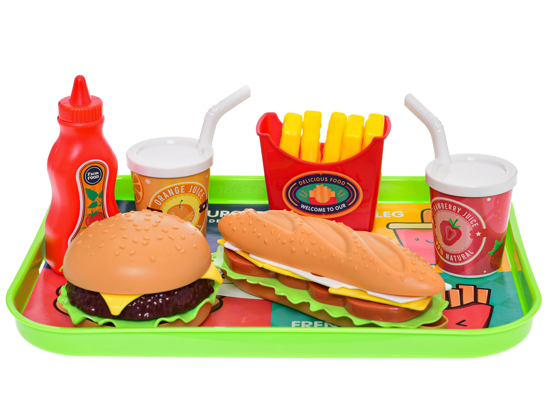 Zábavná hračka pro malé kuchaře: tento set rychlého občerstvení obsahuje 6 realistických kusů jídla a nápojů na praktickém podnose 26 × 19 cm. Podporuje jemnou motoriku, kreativitu a sociální dovednosti při hře na restauraci či občerstvení. Vyrobeno z kvalitního plastu, vhodné pro děti od 3 let.