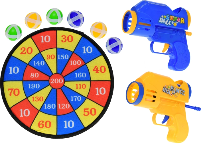 Terč je opatřen očkem pro rychlé zavěšení na zeď či jiný vhodný povrch. Dvě lehké plastové pistole umožní dětem soutěžit v přesnosti a rozvíjet koordinaci oko–ruka a trpělivost.