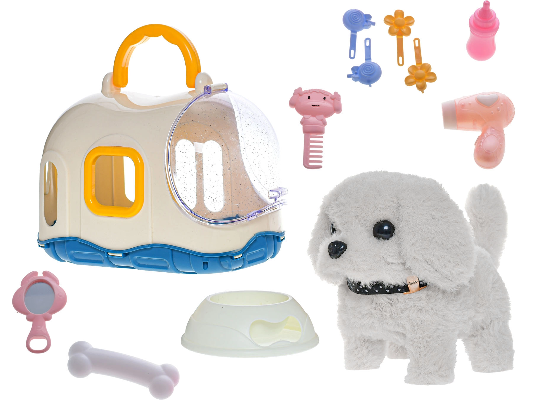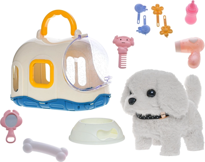 Pejsek je dostupný ve dvou barevných variantách – bílé a béžové. Odolná kombinace plyše a plastu zajišťuje dlouhou životnost, zatímco praktická přepravka dodává hře autentičnost a umožňuje snadné přenášení na cesty či návštěvy.
