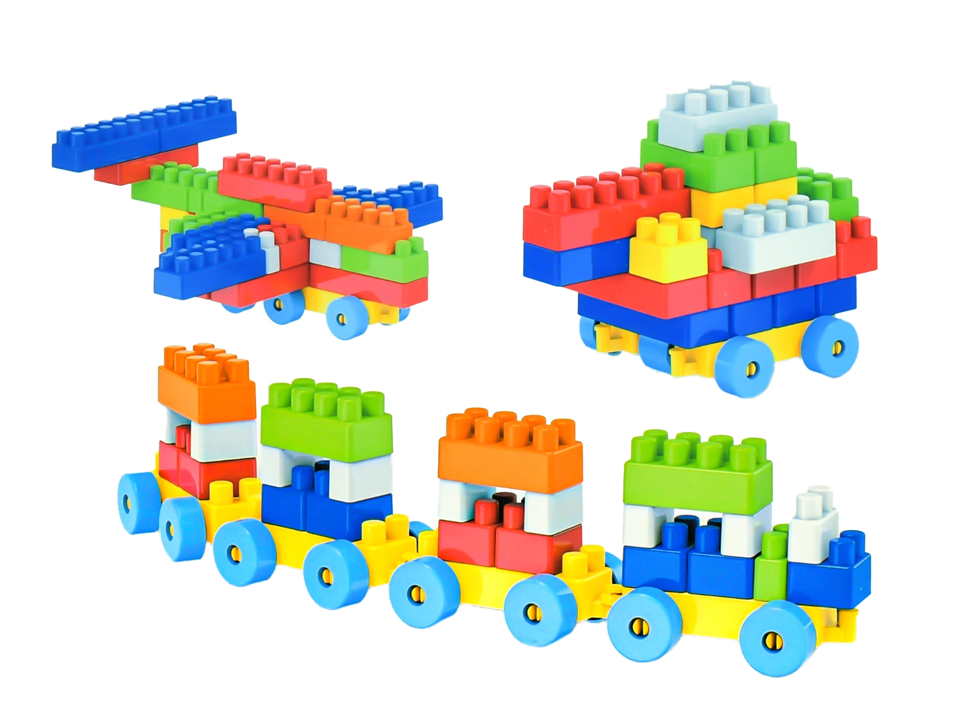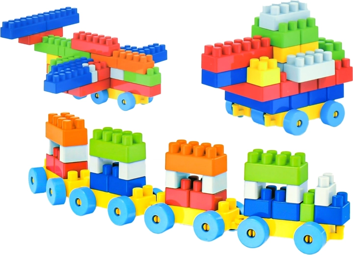 Tato univerzální stavebnice nabízí 100 pevných plastových dílků, včetně podvozků s koly pro snadné vytváření pojízdných modelů. Děti si mohou sestavit vlastní vláček s vagónky, autíčko nebo malé letadlo a libovolně je kombinovat.