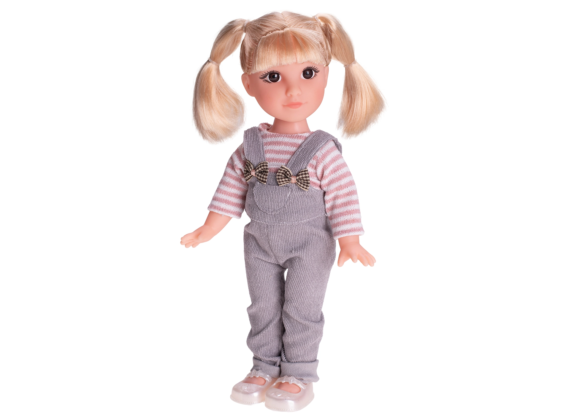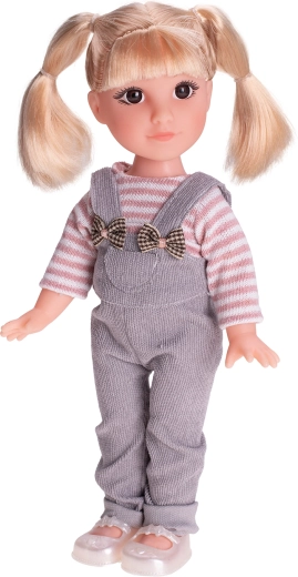 Roztomilá módní panenka s tvrdým plastovým tělem a dlouhými blonďatými vlasy potěší každou malou slečnu. Je oblečena do stylových lacláčků s mašličkami a pruhovaného trička. Součástí je růžový hřeben pro česání, který podporuje kreativitu a jemnou motoriku. Odolné provedení se snadnou údržbou a praktické dárkové balení.