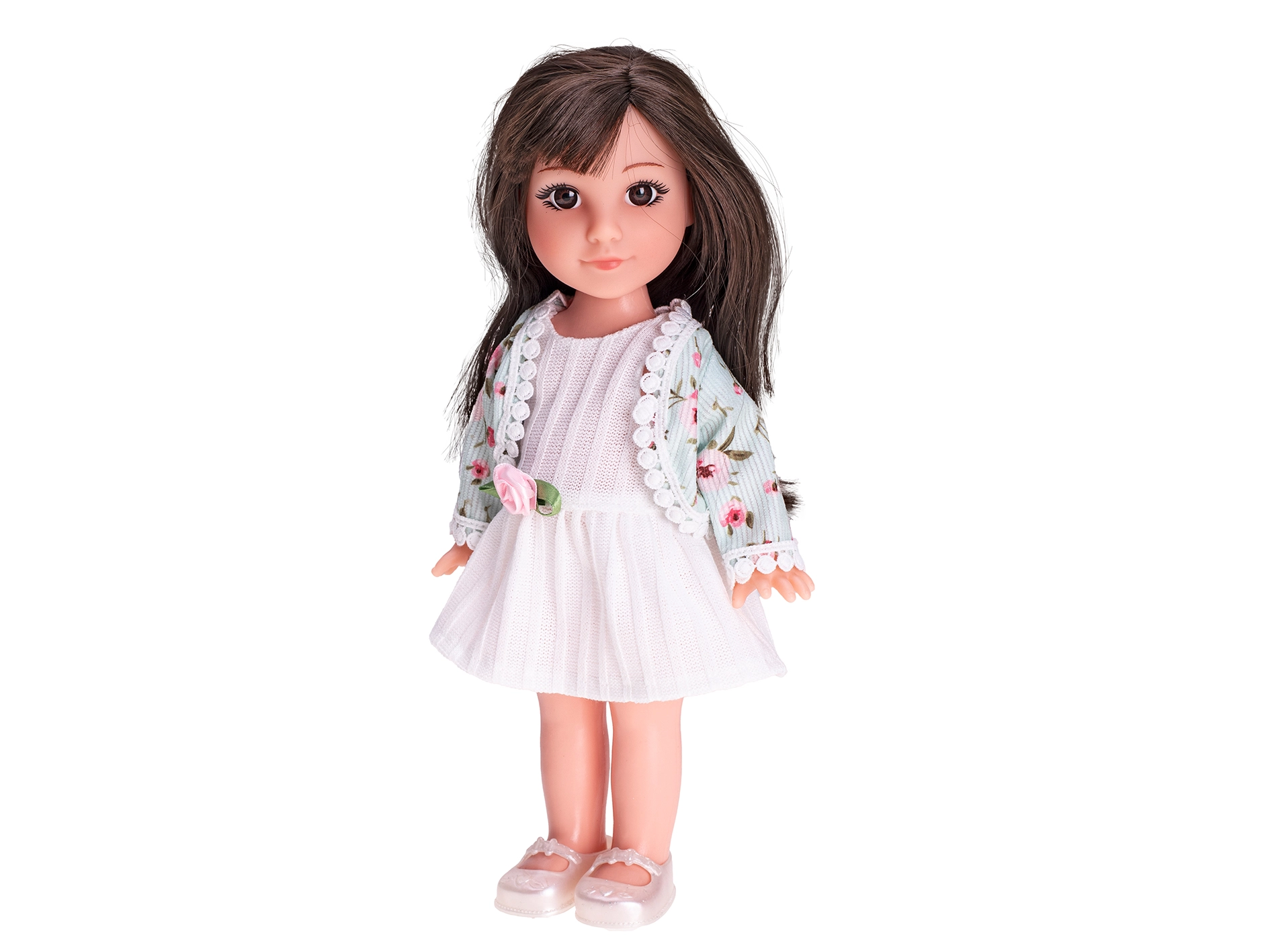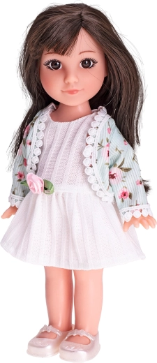 Panenka je dostupná ve dvou stylových provedeních: lacláčky s pruhovaným tričkem pro hravý vzhled nebo elegantní šaty s bolerkem pro slavnostní chvíle. Dodává se v dárkové krabičce, takže potěší při narozeninách, Vánocích i jako milé překvapení.
