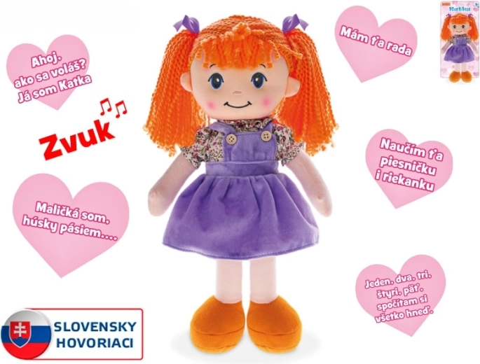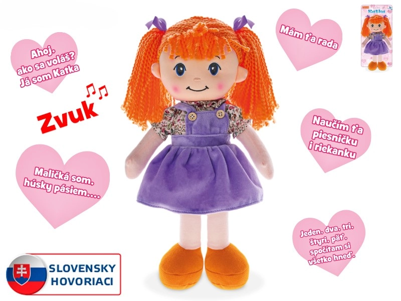 Panenka Katka okouzlí děti svými zrzavými vlásky a milým výrazem. Díky jemnému plyšovému provedení je příjemná na dotek a bezpečná pro dětské objetí už od prvních dnů. Stisknutím bříška začne mluvit a zpívat ve slovenštině – říkanky, písničky a přátelské fráze podporují rozvoj jazykových dovedností i vnímání rytmu a zvuků.