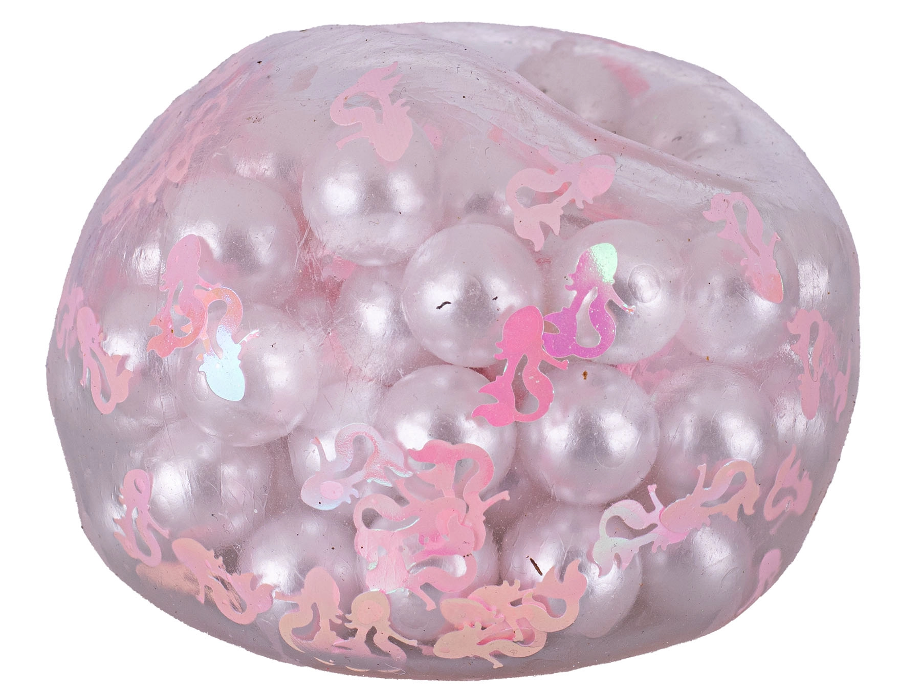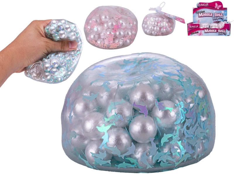 Glamour antistresový míček potěší děti i dospělé. Třpytivé provedení a tři atraktivní motivy – srdíčka, delfíni a mořské panny – z něj dělají zábavnou a zároveň uklidňující pomůcku pro každodenní hraní i relaxaci. Při stlačení se křupající kuličky uvnitř přesouvají, lehce praskají a vytvářejí příjemný zvuk, který pomáhá soustředění i relaxaci.