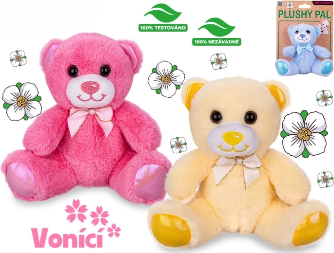 Medvídek je dostupný ve třech atraktivních barvách (modrá, růžová, žlutá), takže jej snadno sladíte s výbavičkou nebo oblíbenými hračkami. Stylová mašle na krku dodává hračce elegantní vzhled a činí z ní i milý dárek k narození miminka či k svátku.