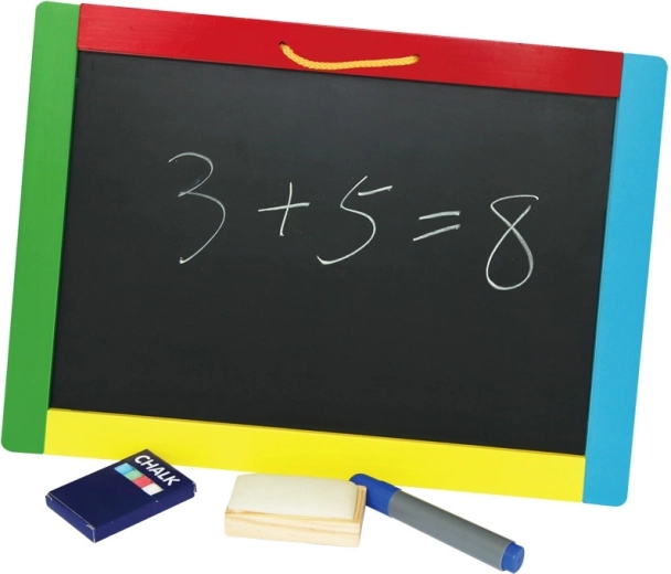 V balení najdete vše potřebné: tabuli se šňůrkou na zavěšení, sadu kříd a fixů a mazací houbičku. Odolná dřevěná konstrukce zajistí stabilitu a bezpečné používání.