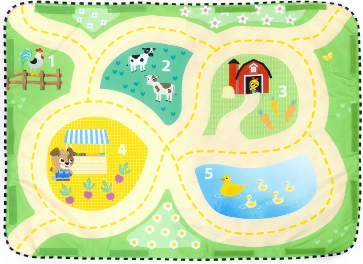 Součástí balení jsou 3 závěsné hračky (zrcátko ve tvaru slunečnice, šustící mrkev a plyšový kamarád housenka) a dvě hudební autíčka (traktor a pickup) se zvuky farmy, zvířat a více než 30 melodiemi. Deka je snadno pratelná v pračce a díky kvalitním materiálům nabízí dlouhou životnost i bezpečnou hru každý den.
