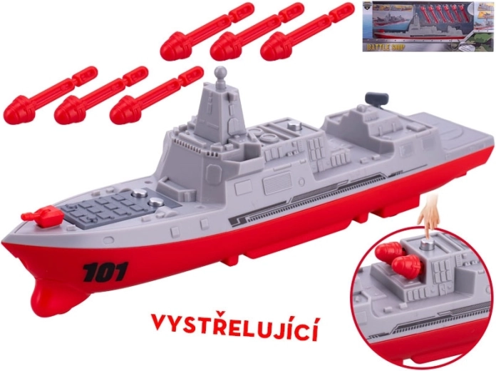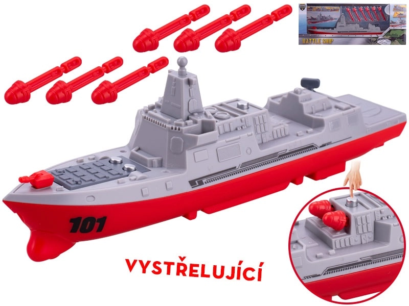 Realistická hračka válečné lodi o délce 24 cm přináší dětem akční zábavu bez baterií. Díky setrvačníkovému pohonu se loď plynule rozjíždí vpřed a střílí projektily pro ještě větší napětí. Autentické šedé provedení s červenými detaily osloví malé fanoušky techniky, zatímco snadné ovládání podporuje rozvoj motoriky a koordinace. Vhodné pro děti od 3 let.
