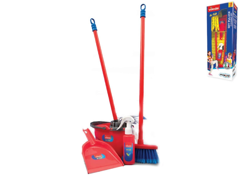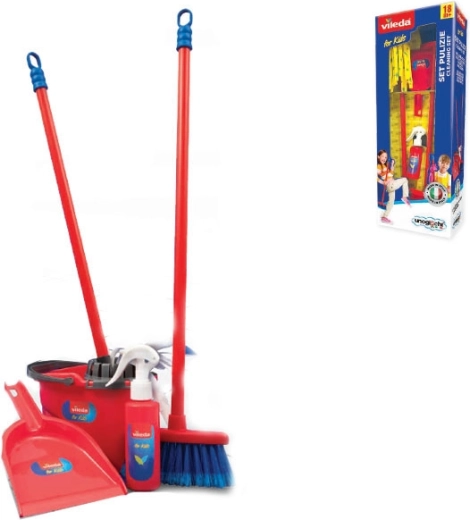 Zábavná a realistická úklidová sada pro děti od 18 měsíců inspirovaná vybavením Vileda. Obsahuje 5 základních nástrojů – kbelík se ždímačem, mop, smeták, lopatku a klepač na koberce. Lehká a odolná plastová konstrukce, přizpůsobená dětským rukám, podporuje rozvoj motoriky a smysl pro pořádek.