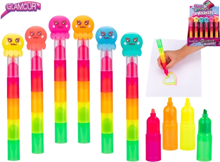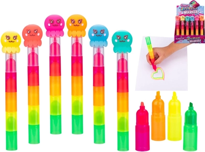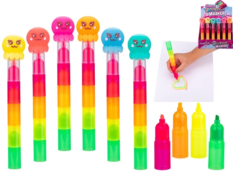 Objevte zábavný a praktický způsob zvýrazňování. Tento pětibarevný zvýrazňovač ve tvaru chobotnice kombinuje oranžovou, růžovou, modrou, zelenou, žlutou a červenou v jednom těle, takže můžete rychle přepínat barvy bez výměny nástroje. Díky délce 18 cm a průměru 3 cm se skvěle drží a je ideální pro denní použití.