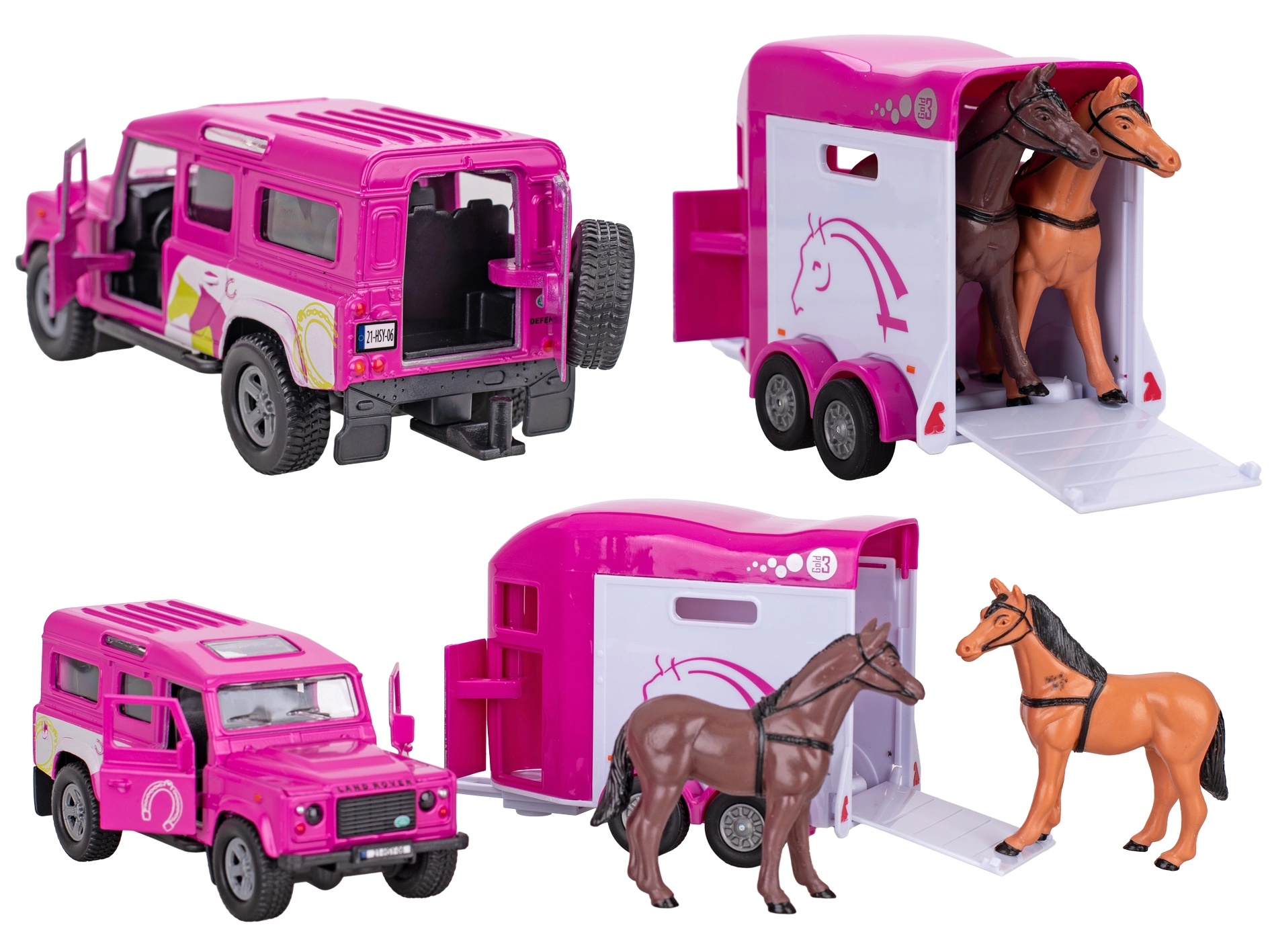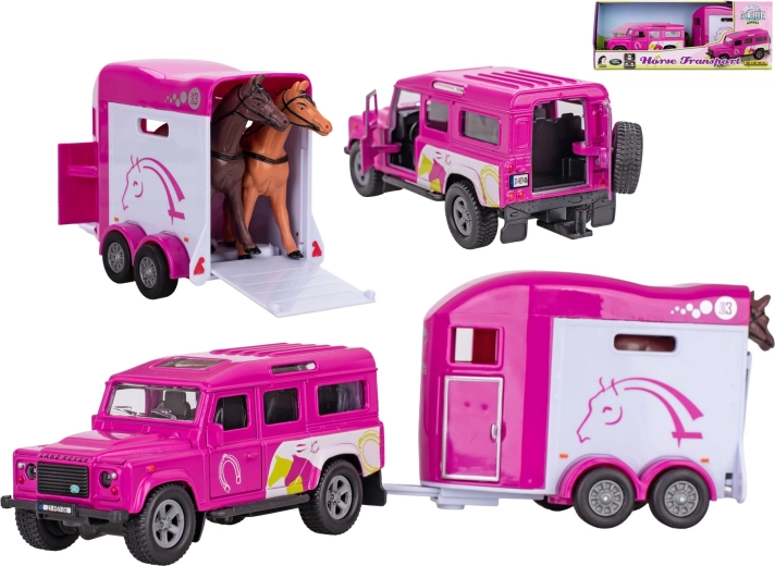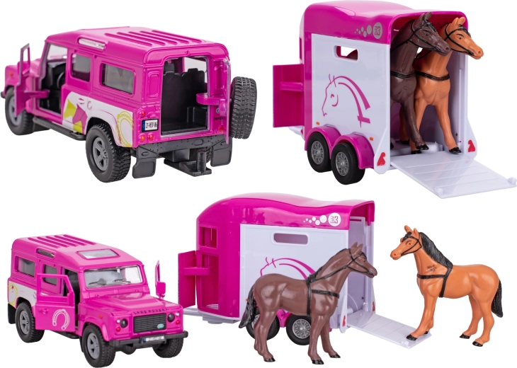 Stylový kovový model Land Roveru s přívěsem pro koně v růžové barvě potěší všechny malé milovnice jízdy a farmy. Nabízí zpětný chod pro snadnou jízdu, otevíratelné přední dveře a odolné zpracování z kovu a plastu. Přívěs je připraven pro bezpečnou přepravu figurek koní (nejsou součástí). Délka soupravy 28 cm a balení v krabičce z něj dělají skvělý dárek pro děti od 3 let.