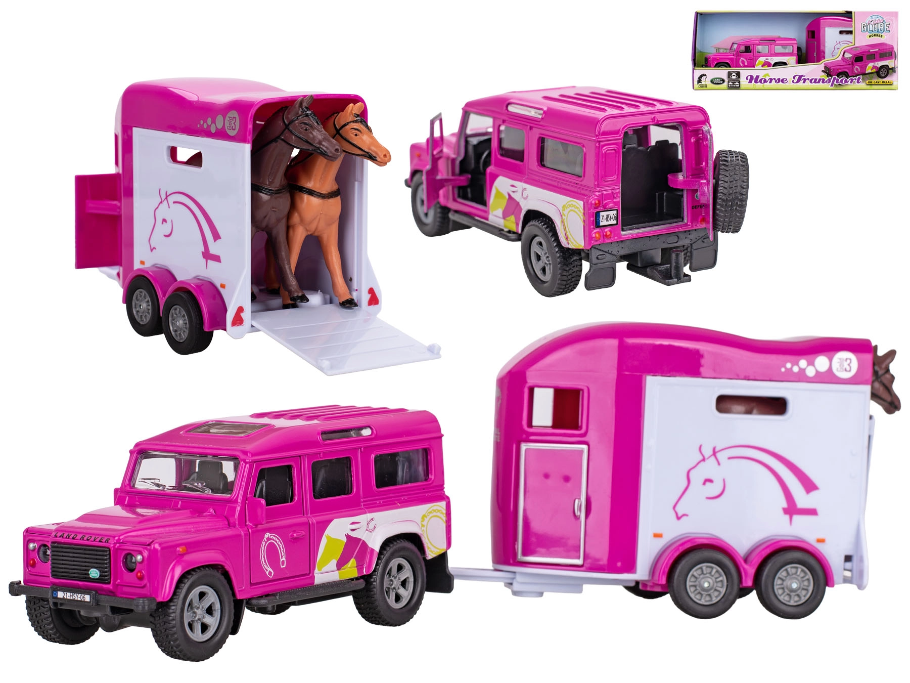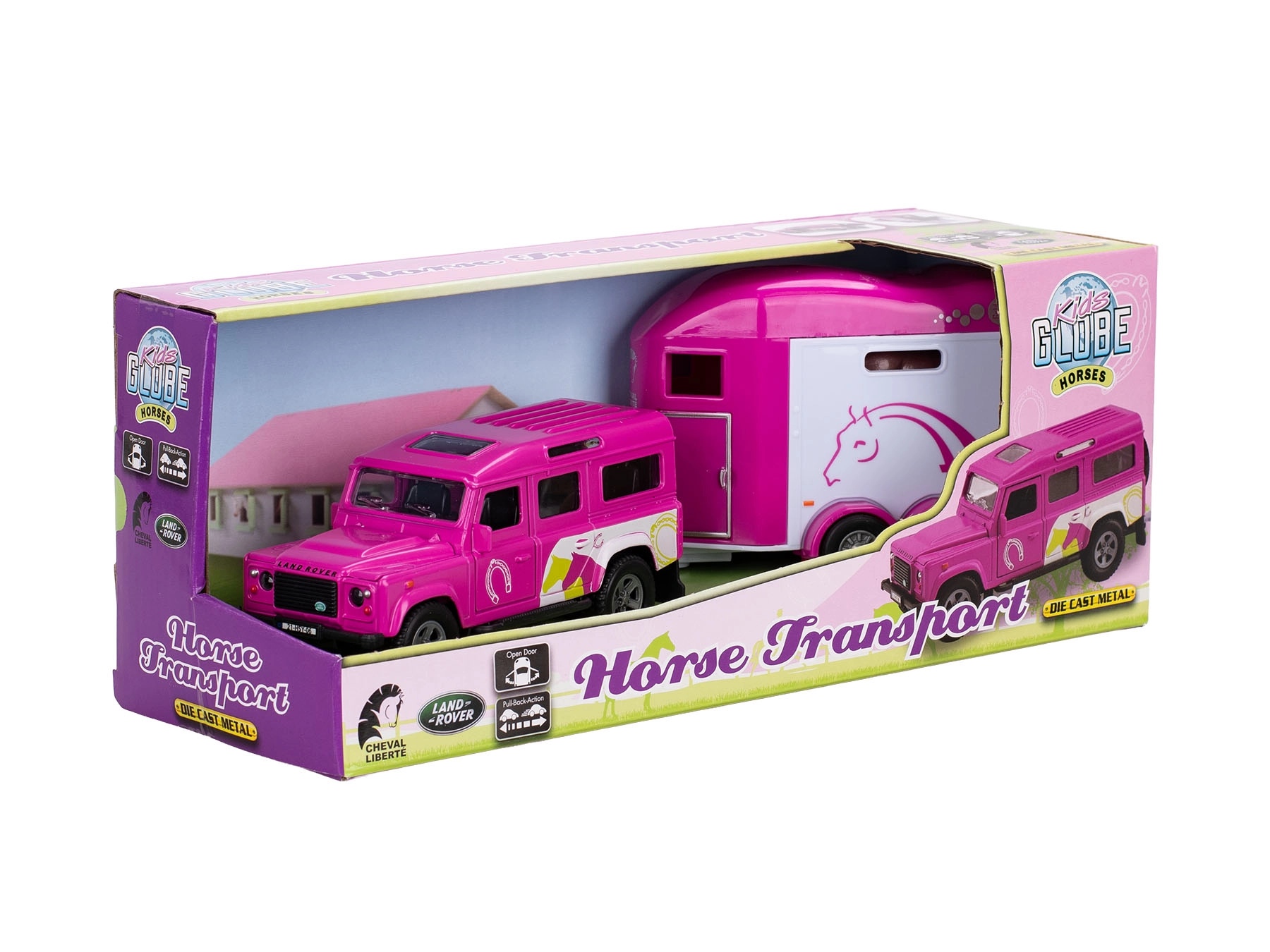 Objevte realistickou soupravu Kids Globe s ikonickým vozidlem Land Rover a přívěsem pro přepravu koní v atraktivní růžové barvě. Detailní provedení karoserie i interiéru, otevíratelné přední dveře a zpětný chod zaručují spoustu herních možností a zábavy. Díky kombinaci kovu a kvalitního plastu je model odolný a připravený na každodenní hraní.
