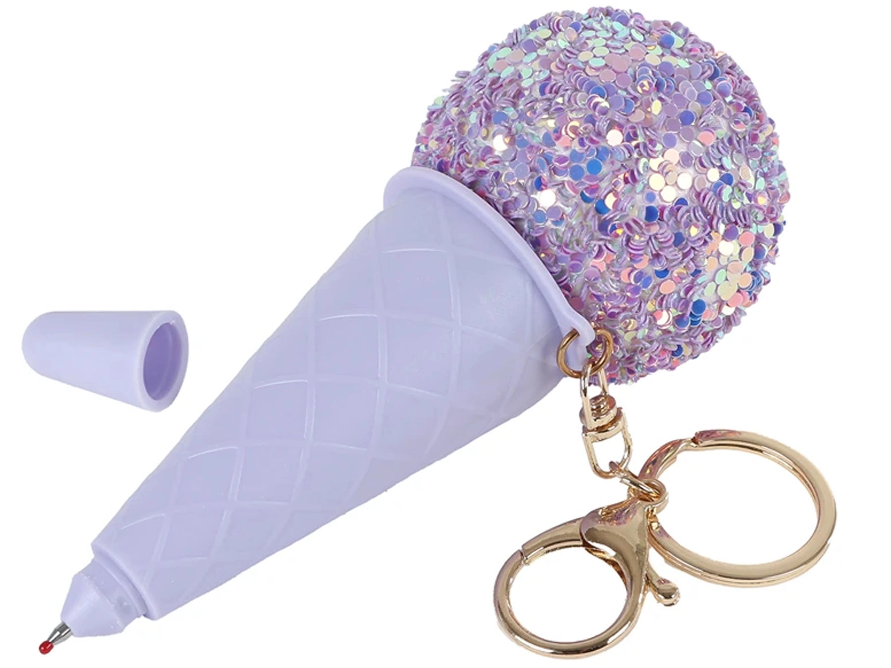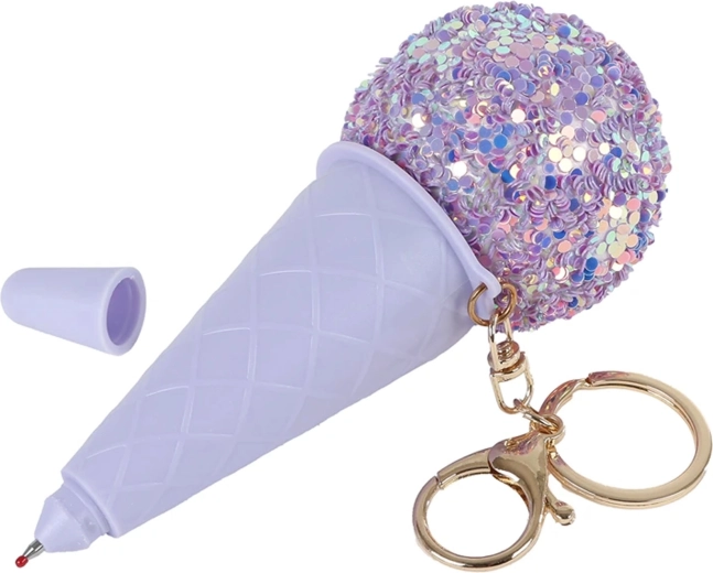 Stylový Glamour přívěsek na klíče ve tvaru zmrzliny kombinuje praktickou propisku s hravým designem. Je vyroben z odolného plastu, má délku přibližně 14 cm a díky třpytivému fialovému povrchu okamžitě zaujme. Snadno jej připevníte na klíče, batoh nebo kabelku a je skvělým malým dárkem pro děti od 3 let i pro hravé dospělé.