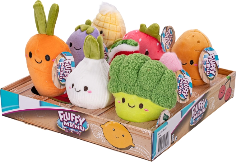 Roztomilé plyšové hračky Fluffy Menu ve tvaru ovoce a zeleniny potěší děti od narození. Jsou měkoučké, lehké a ideální do malých ruček. Devět různých druhů s veselými obličejíky a pohyblivými nožičkami podporuje hru, fantazii a učení o zdravé stravě. Každý kus je dodáván samostatně, takže při rozbalení čeká překvapení. Měkký plyš, kompaktní velikost 12–14 cm a dělají z těchto kamarádů perfektní volbu pro nejmenší.