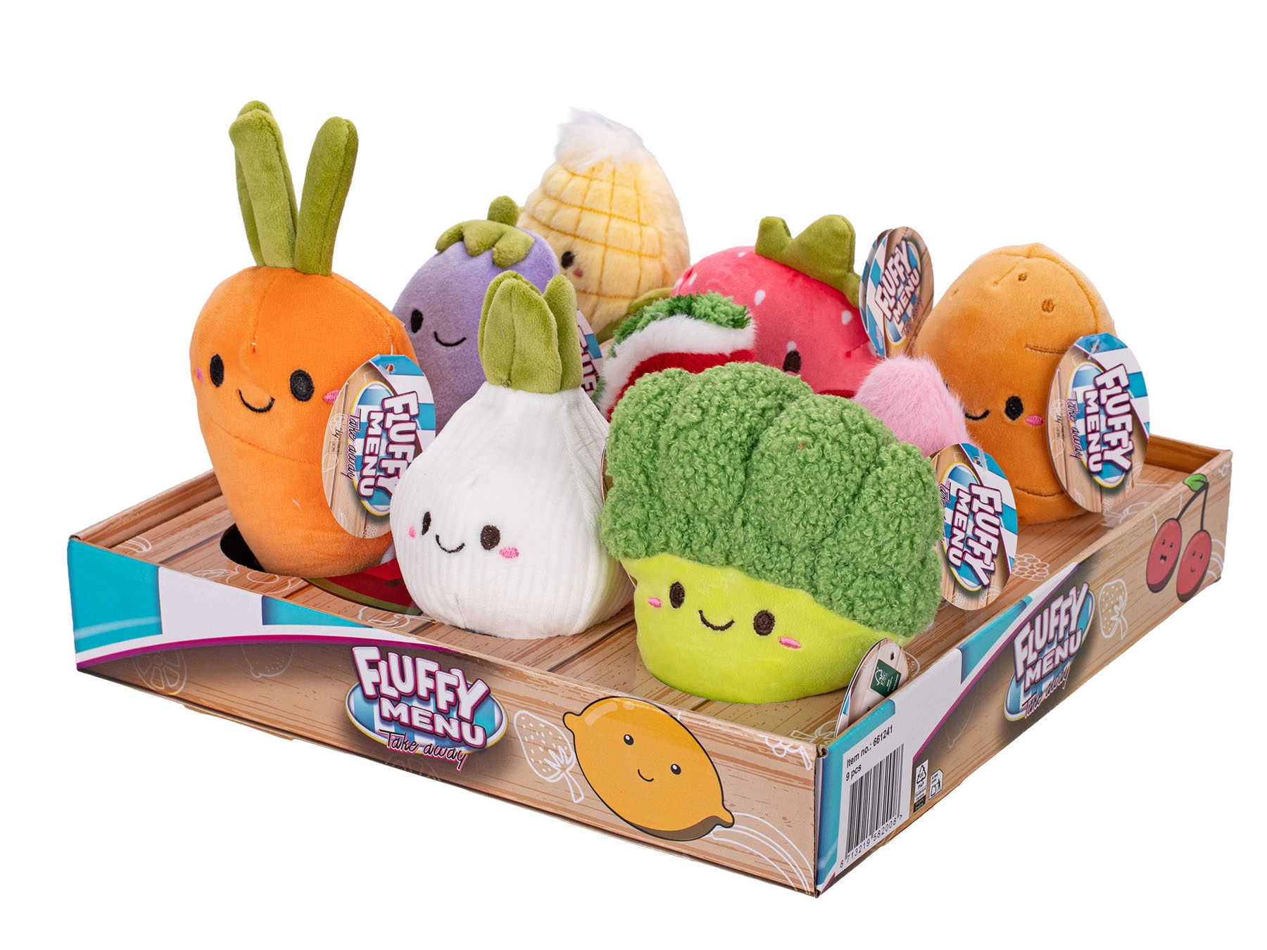 Na výběr je 9 druhů: brokolice, kukuřice, brambora, meloun, cibule, jahoda, lilek, mrkev a ředkev. Každá hračka je dodávána jednotlivě, což přináší radostný moment překvapení při rozbalení. Veselé výrazy a výrazné barvy rozvíjejí představivost a motivují děti ke zábavnému učení o zdravé výživě.