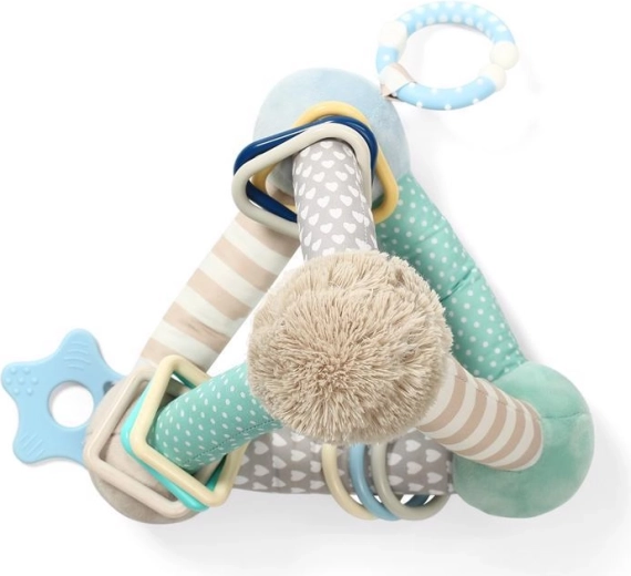 Trojúhelníkový tvar s polstrovanými rohy a kroužky je ideální pro první úchop, třesení a přendávání z ruky do ruky.