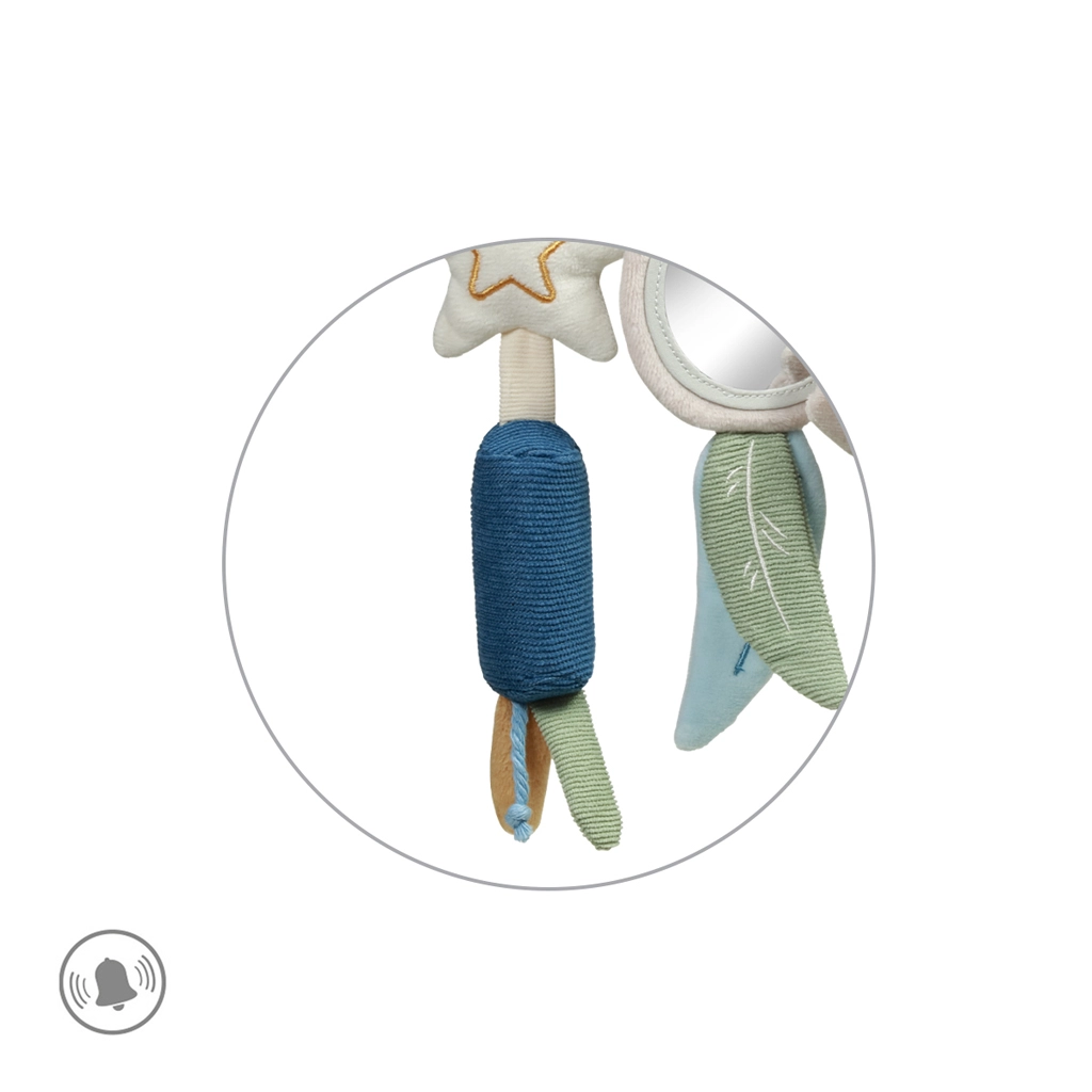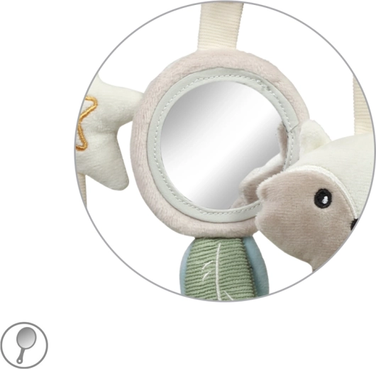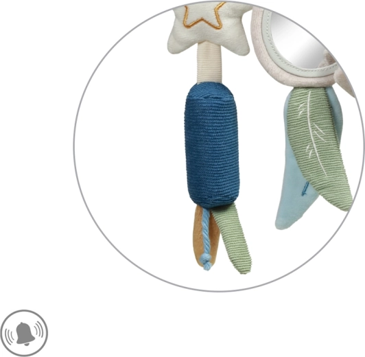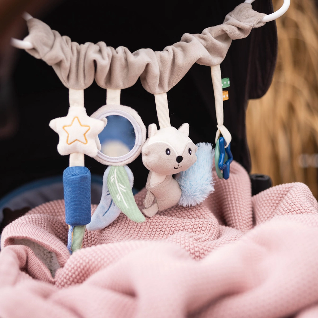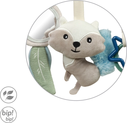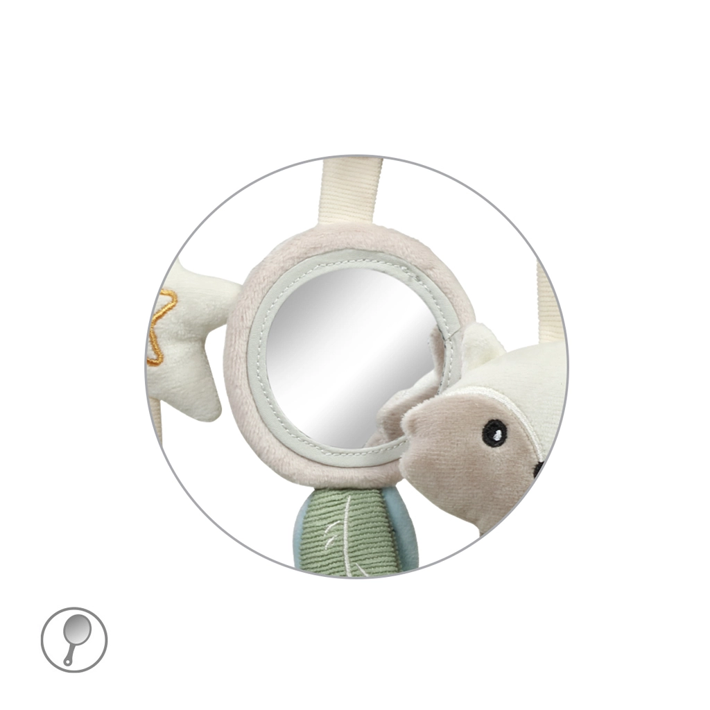 Součástí jsou oblíbené prvky: flexibilní zrcátko pro objevování vlastního odrazu, šušťící lístky a ocásek mývala pro trénink pozornosti, jemně zvonící zvonečky k uklidnění a kousátko ve tvaru hvězdy pro úlevu při prořezávání zoubků. Promyšlené detaily udržují dětskou pozornost a podporují koordinaci ruka–oko.