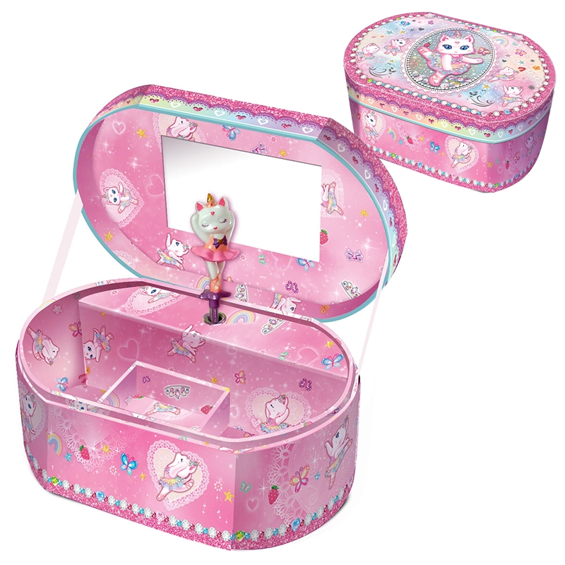 Tato oválná hudební šperkovnice s kočičím motivem je navržena pro malé milovnice pokladů. Po otevření spustí jemnou melodii, která zpříjemní každé ukládání šperků. Vnitřní prostor je ideální na prstýnky, náramky, náušnice i gumičky do vlasů.