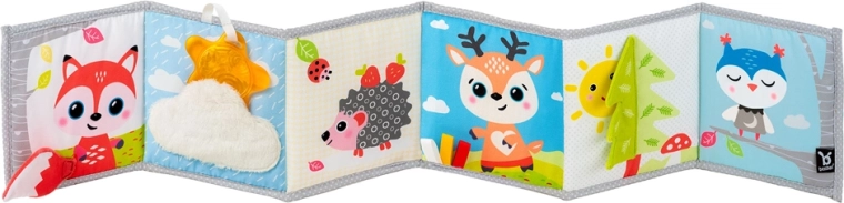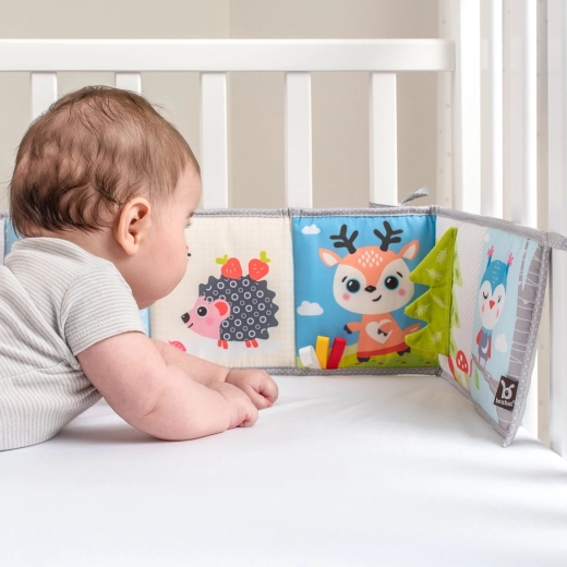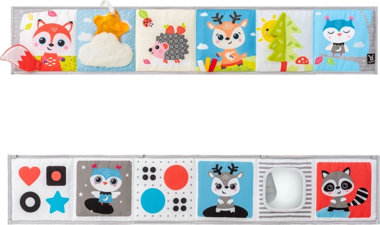 Oboustranná aktivní knížka BENBAT Lesní kamarádi roste s vaším miminkem. Strana s vysokým kontrastem (černobílá) ideálně stimuluje zrak novorozence, zatímco barevná strana s veselými zvířátky rozvíjí pozornost a soustředění ve vyšších fázích vývoje. Měkké materiály, šustivé zóny, hmatové stužky a velké zrcátko lákají ke zkoumání a podporují jemnou i hrubou motoriku.