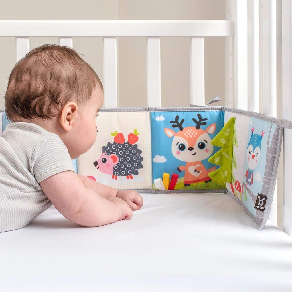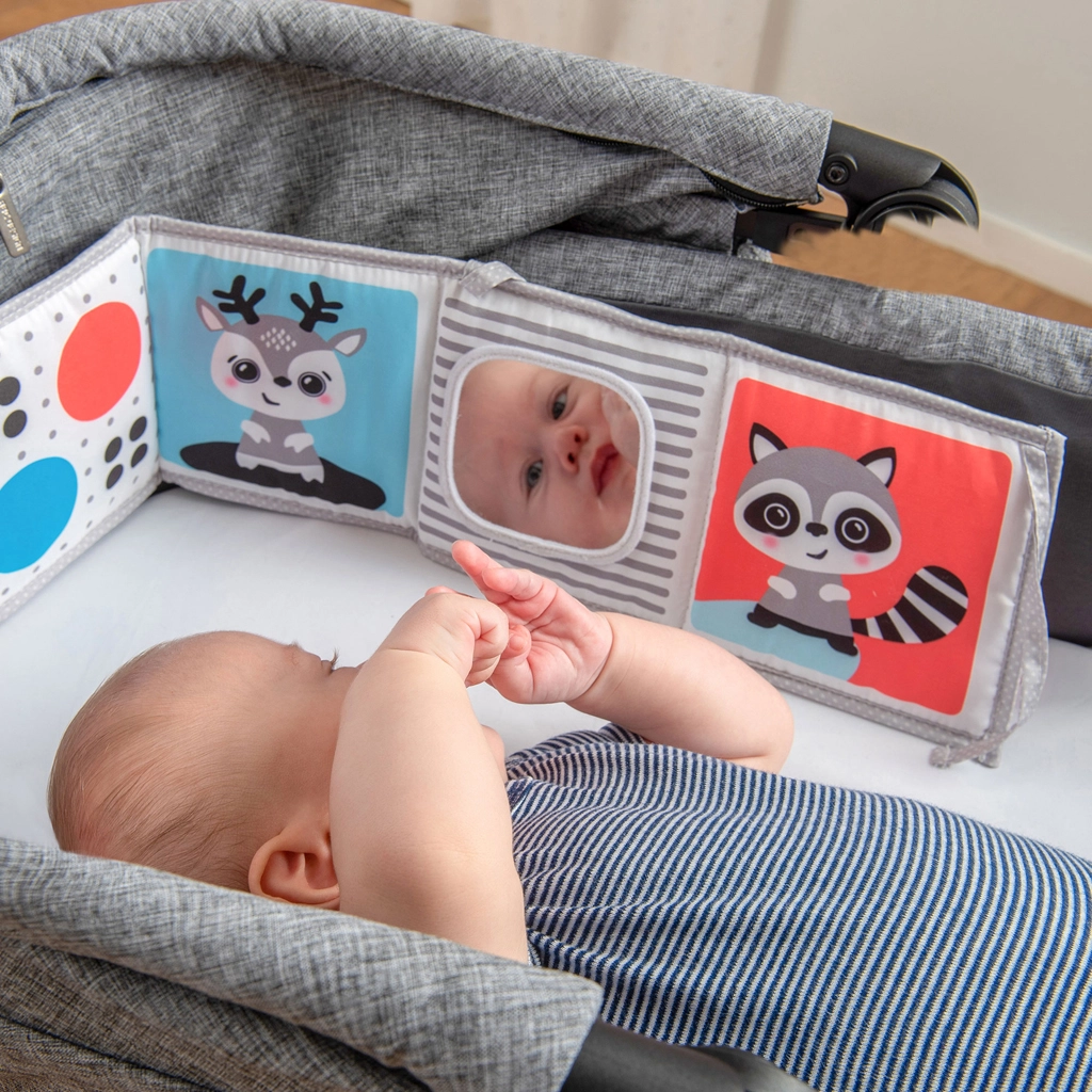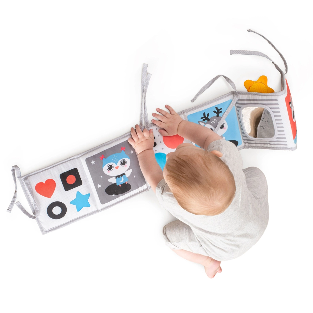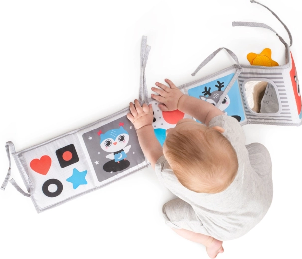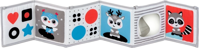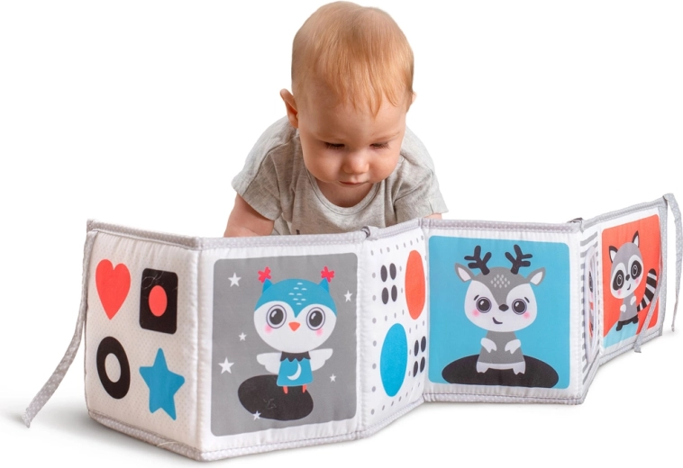 Měkká textilní knížka pro miminka od narození podporuje vizuální stimulaci, čas na bříšku i smyslové objevování. Nabízí černobílou stranu pro novorozence a barevnou stranu pro další vývojová stádia, velké bezpečné zrcátko, šuštivé a hmatové prvky a možnost postavit, položit naplocho nebo přivázat do postýlky či kočárku. Snadno se skládá a vezmete ji kamkoli s sebou.