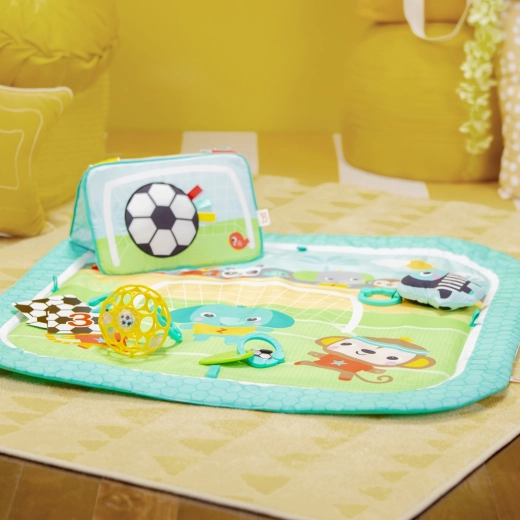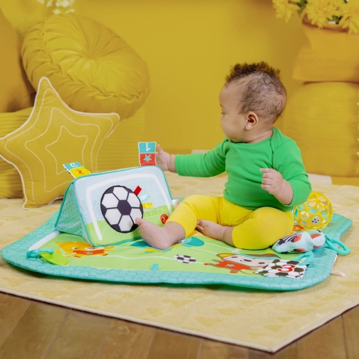Součástí je 4+ odnímatelných hraček: kartičky s čísly a zvířátky, plyšový tukan se zvonkem, texturované listy – kousátko a klasický snadno uchopitelný OBALL. Podporujte první „góly“ vašeho malého fotbalisty každý den.