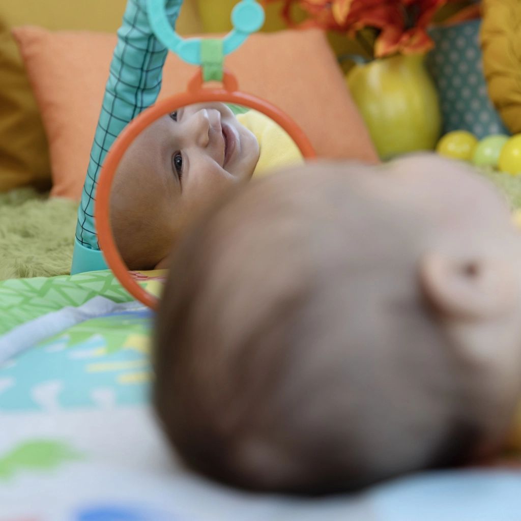 Bezpečné zrcátko, kroužky, sluníčko a listové kousátko podporují sebeuvědomění a smyslový rozvoj.