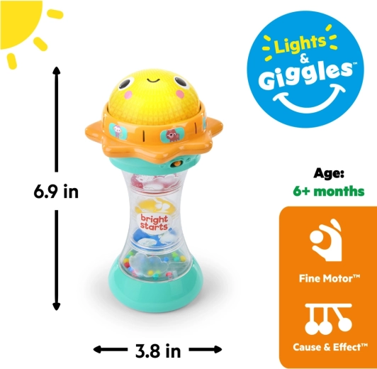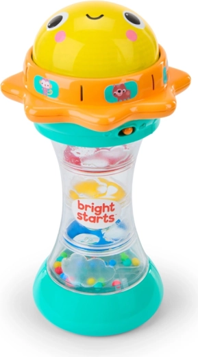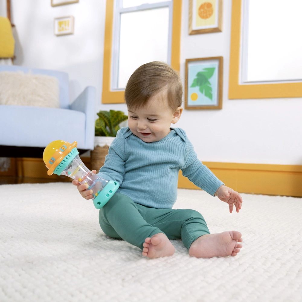 Zatřeste hračkou a sledujte, jak se barevné kuličky v průhledné komoře rozkutálejí. Dítě získává vizuální i zvukovou stimulaci a trénuje jemnou motoriku.